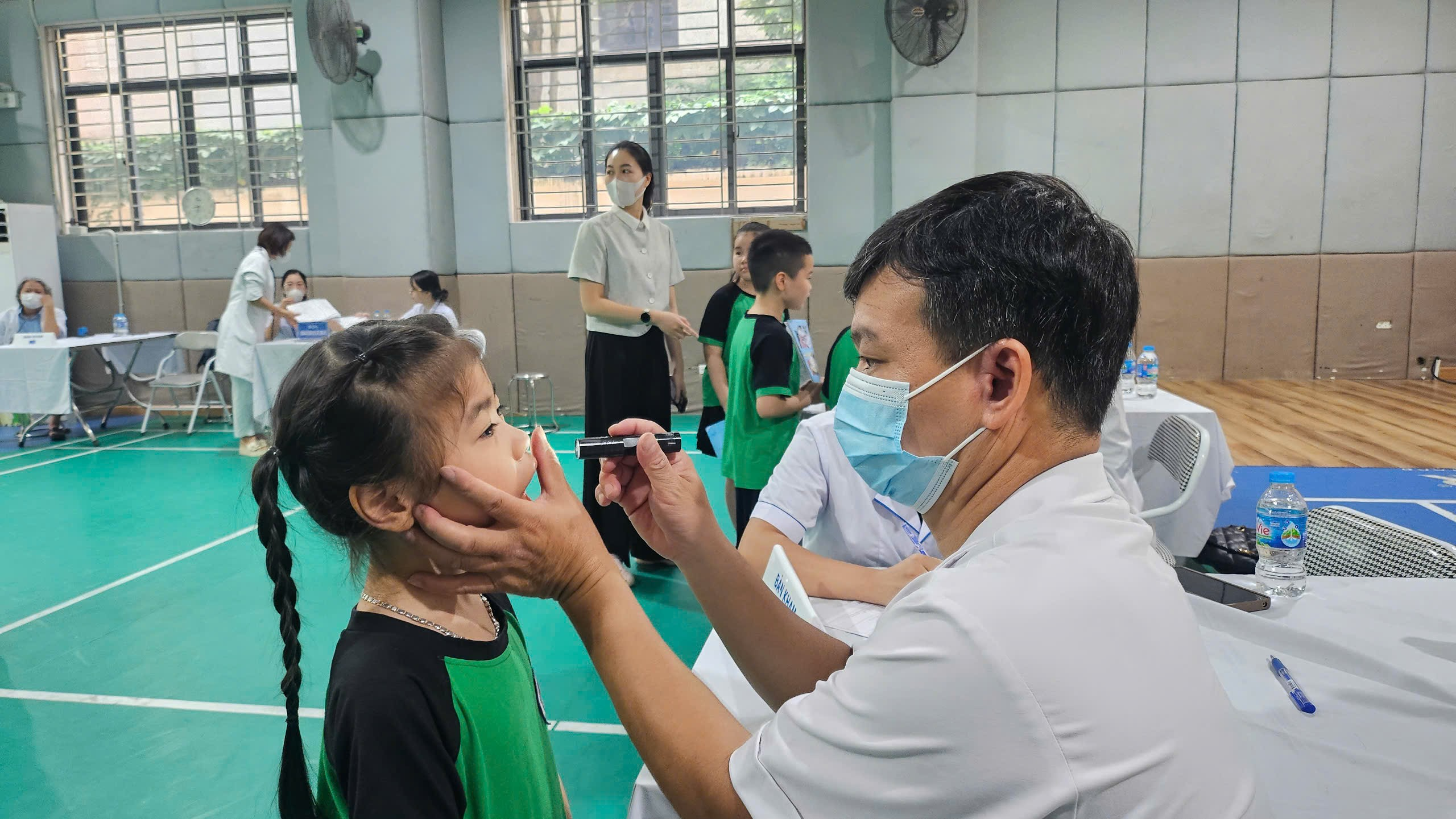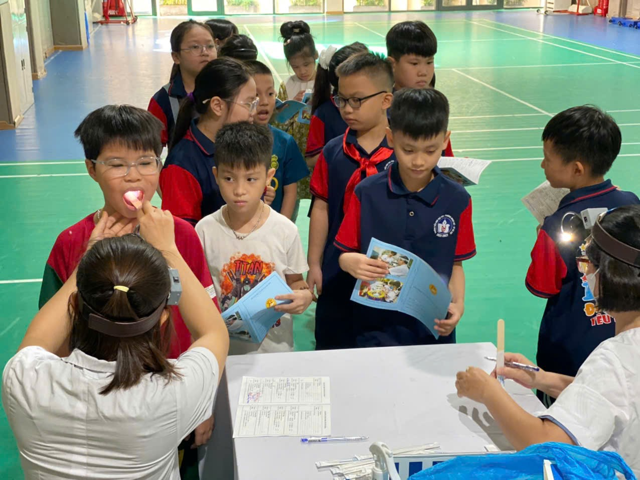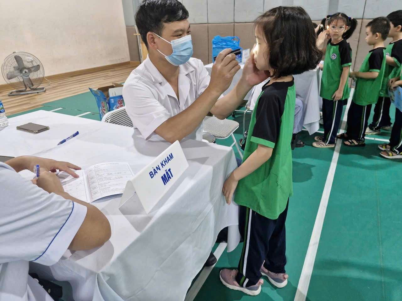 Trong buổi khám sức khỏe, các em học sinh được khám lần lượt từ đo thị giác, tai - mũi - họng và răng - hàm - mặt, nội khoa…