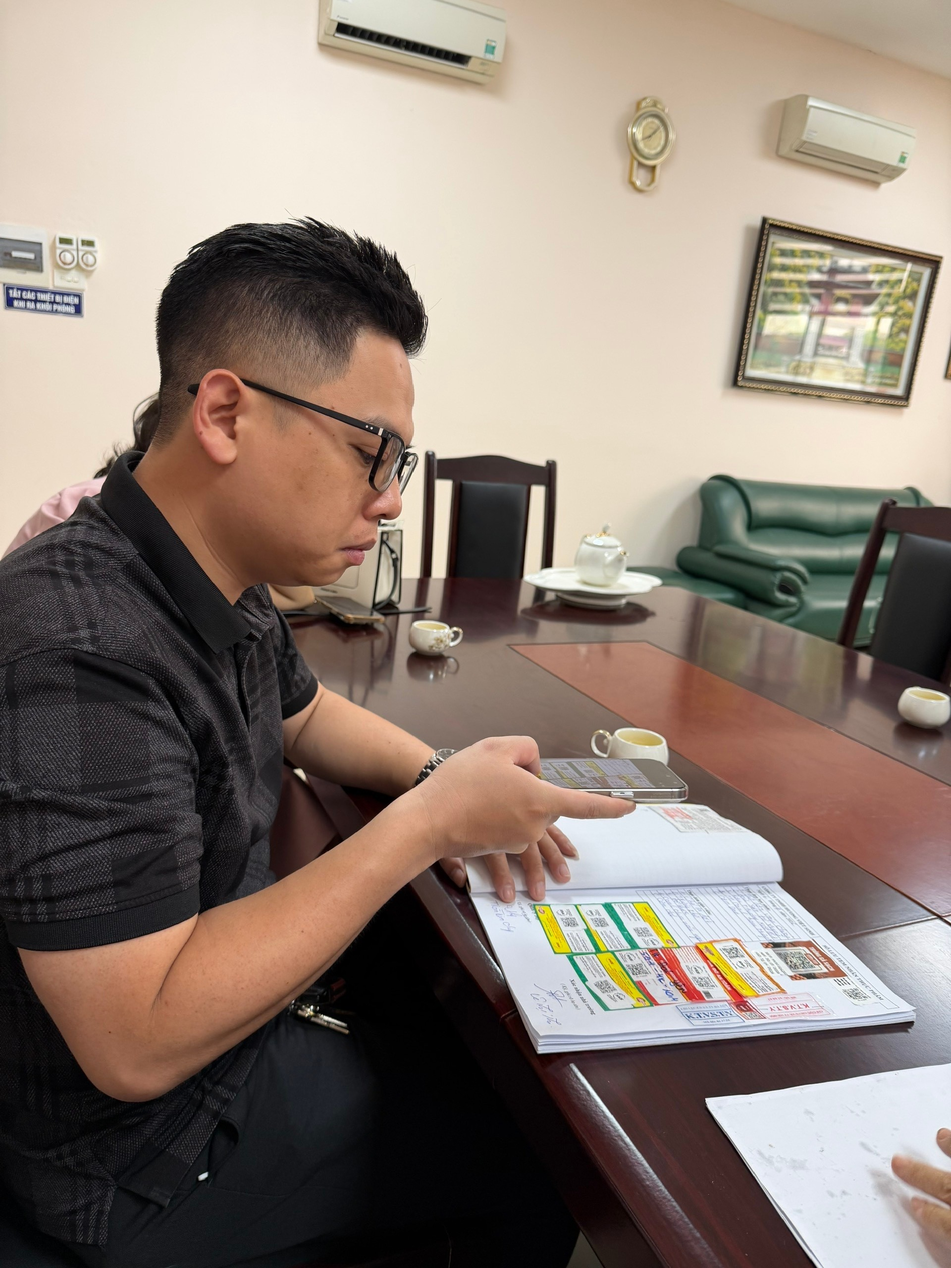 Ông Nguyễn Thế Anh –TBĐD phụ huynh Khối 5 quét mã QR truy suất nguồn gốc thực phẩm.