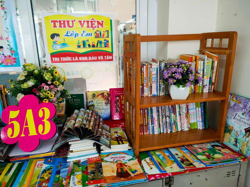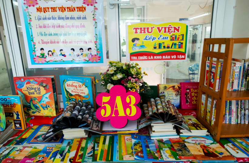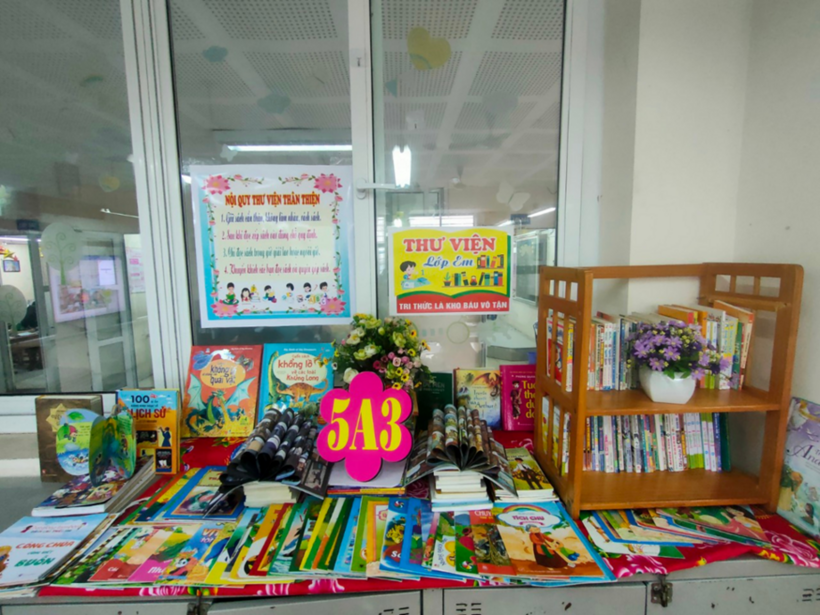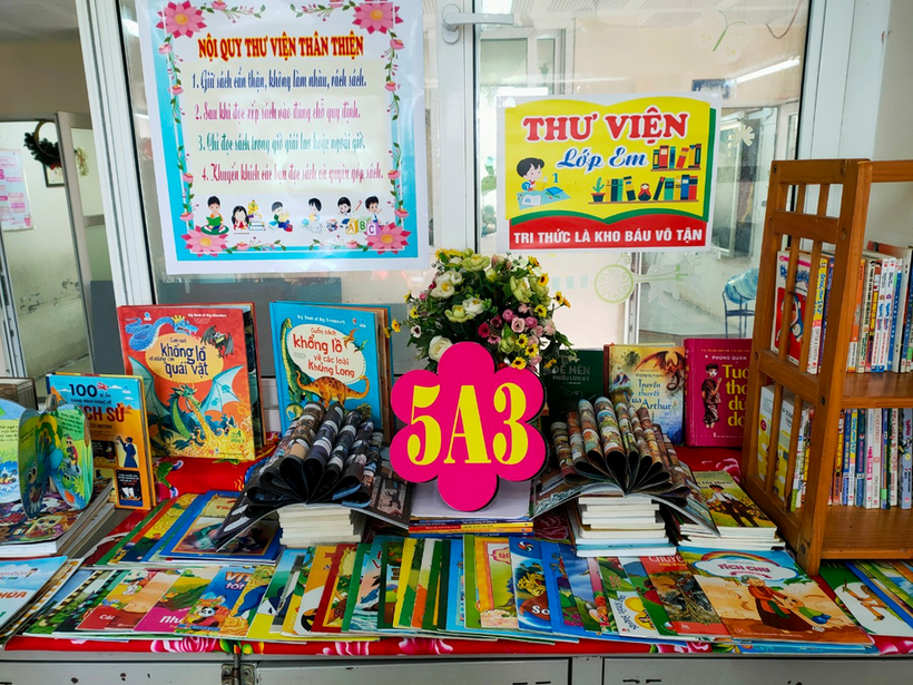 Hòa chung không khí thi đua sôi động, náo nhiệt đó, cô và trò lớp 5A3 đã trưng bày, triển lãm góc “thư viện thân thiện” tại lớp học. Qua góc thư viện này các con được thỏa sức chứng minh sự khéo léo, sáng tạo của mình qua cách trang trí, trưng bày sách đặc biệt nhất là các con thể hiện niềm đam mê đặc biệt của mình đối với sách.