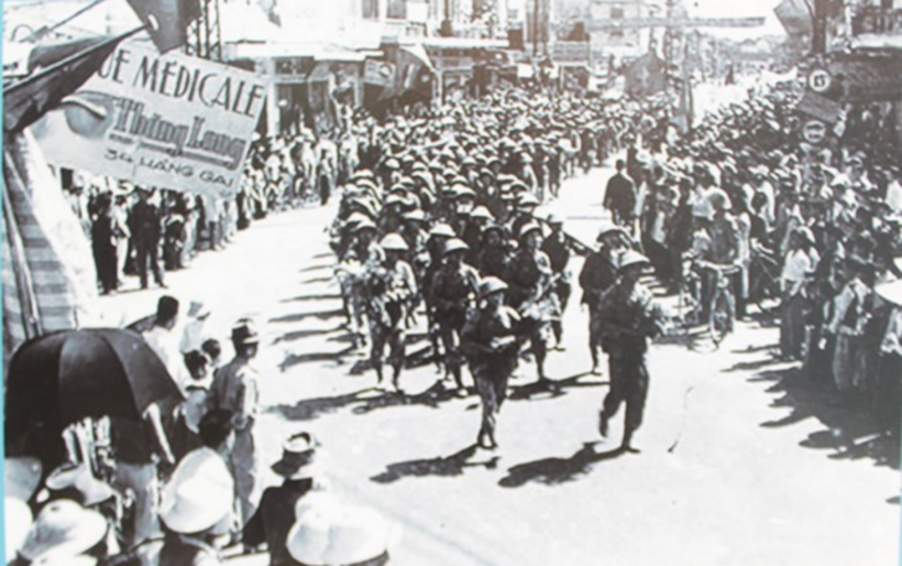 Đoàn bộ binh hành quân trên phố Hàng Gai
