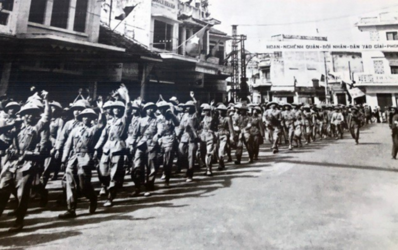 Các chiến sĩ bộ binh của Trung đoàn Thủ đô tiến về tiếp quản Thủ đô,