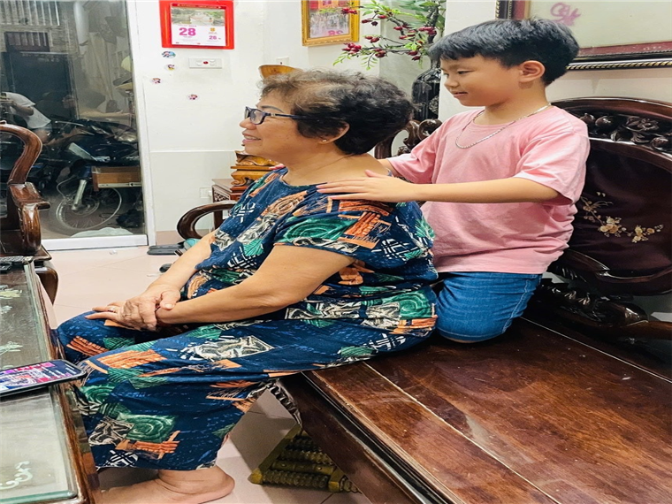 Bạn Phúc Khang mỗi bữa cơm ăn xong bạn đều lấy tăm, rót nước mời bà. Buổi tối học xong bài, bạn đều bóp vai đấm lưng cho bà.