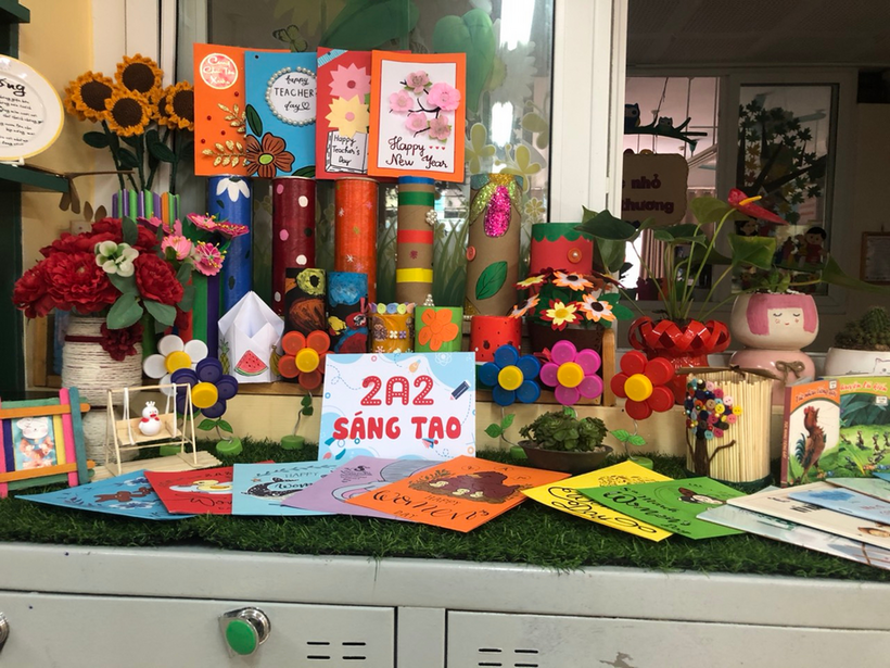 Những sản phẩm này được học qua các tiết học mĩ thuật và hoạt động trải nghiệm. Bên cạnh đó là những tấm thiệp dành tặng cô, tặng ông bà, cha mẹ vào các dịp lễ trong năm.