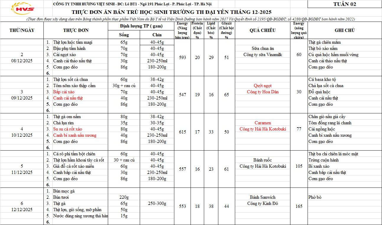 Thực đơn tuần 15 -2025