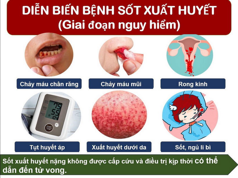Các biểu hiện nặng khiến người bệnh nhập viện là: Người bệnh đau bụng nhiều, đau liên tục, đau nhiều vùng gan, đôi khi bệnh nhân có thể lơ mơ, rối loạn tri giác. Ngoài ra, người bệnh có biểu hiện nôn ói, khó thở, chảy máu chân răng, chảy máu mũi, chảy máu miệng, nôn ra máu, đại tiện phân đen hoặc máu, tiểu máu, xuất huyết âm đạo bất thường… cần nhập viện ngay lập tức để được các bác sĩ điều trị. Thông thường, các biểu hiện nguy hiểm này thường từ diễn biến ở ngày 3 đến ngày 7 của bệnh sốt xuất huyết.