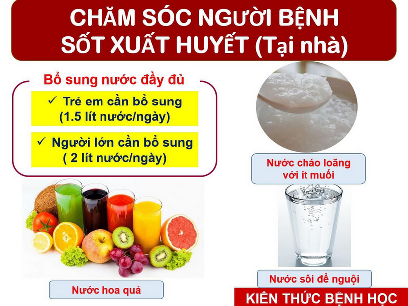 Người bệnh mắc sốt xuất huyết khi bị sốt cao nên bổ sung các loại nước để bù nước, chất điện giải. Có thể uống oresol, nước cam, chanh, bưởi, dừa, nước ép rau củ quả... để tiêu hóa tốt, tăng cường kháng thể giúp phục hồi sức khỏe nhanh chóng.