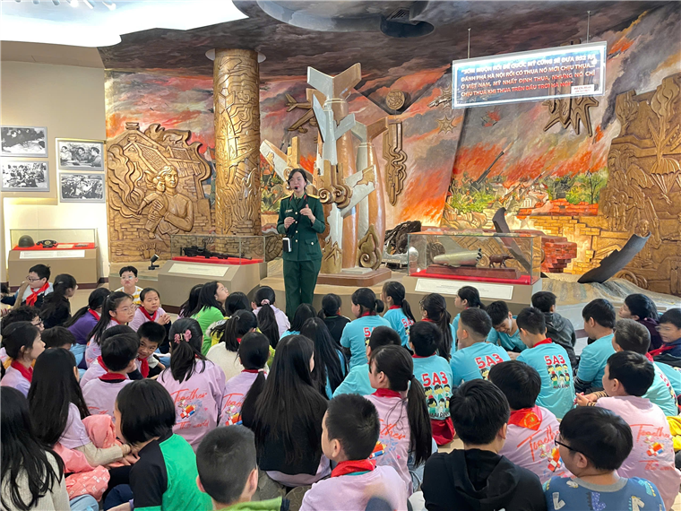 Vào khu trưng bày trong nhà, học sinh được tìm hiểu khái quát về truyền thống của lực lượng vũ trang Thủ đô Hà Nội qua các thời kỳ, đặc biệt là chiến thắng “Hà Nội-Điện Biên Phủ trên không”, với nhiều hiện vật, tài liệu, các tác phẩm nghệ thuật.