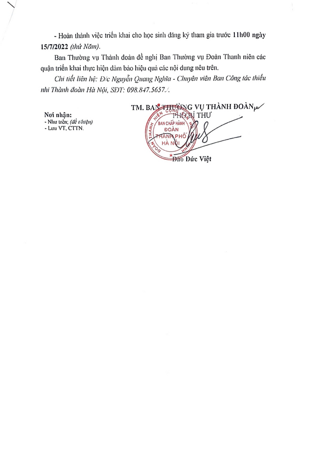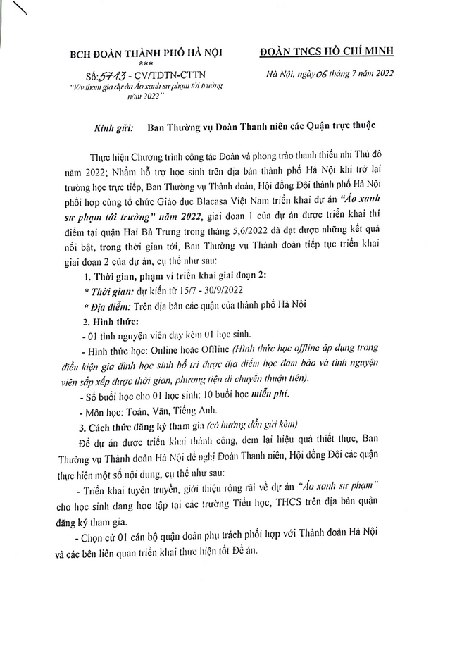 Dưới đây là Công văn của BCH Đoàn Thành phố Hà Nội cũng như hướng dẫn để đăng ký tham gia chương trình :