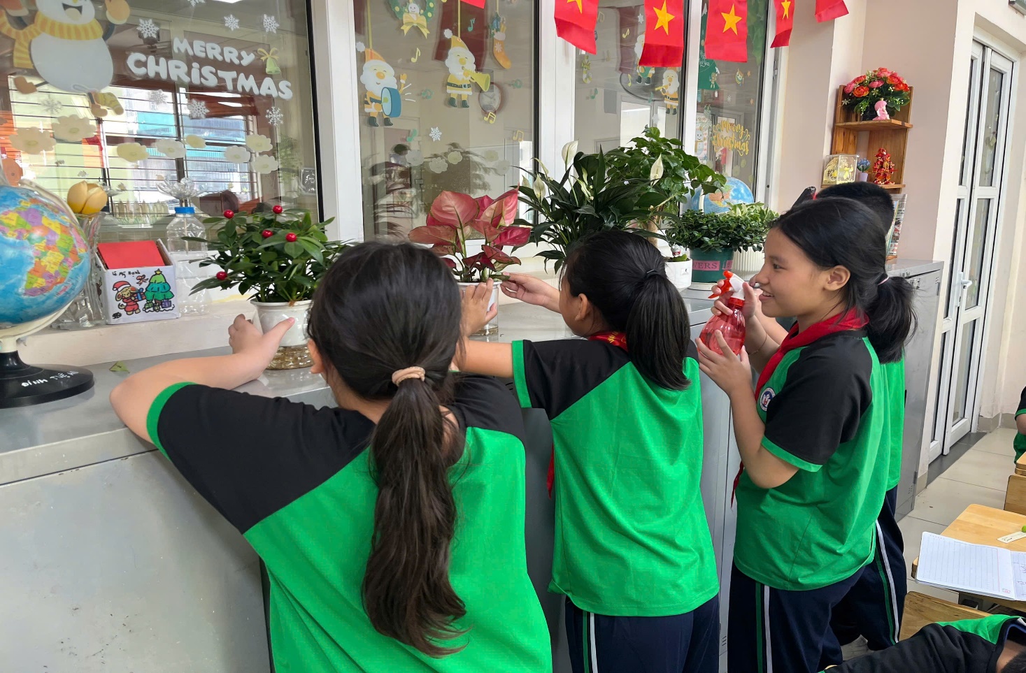 Dưới đây là một số hình ảnh các con học sinh cùng nhau chăm sóc cây: