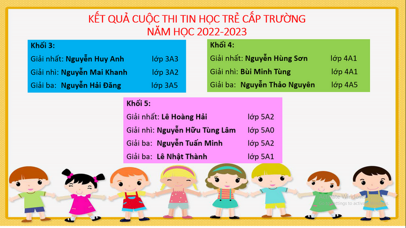 Chào mừng kỉ niệm 40 năm Ngày Nhà giáo Việt Nam ( 20/11/2082 – 20/11/2022), trong hai ngày 03 và 04/11/2022, trường Tiểu học Đại Yên đã tổ chức kì thi Tin học trẻ cấp trường dành cho các bạn học sinh khối 3;4;5. Cuộc thi đã thu hút đông đảo các bạn học sinh tham gia. Ban chấm thi đã rất khó khăn khi lựa chọn giải bởi kết quả của những thí sinh đạt giải đều chỉ cách nhau 0.5 điểm.