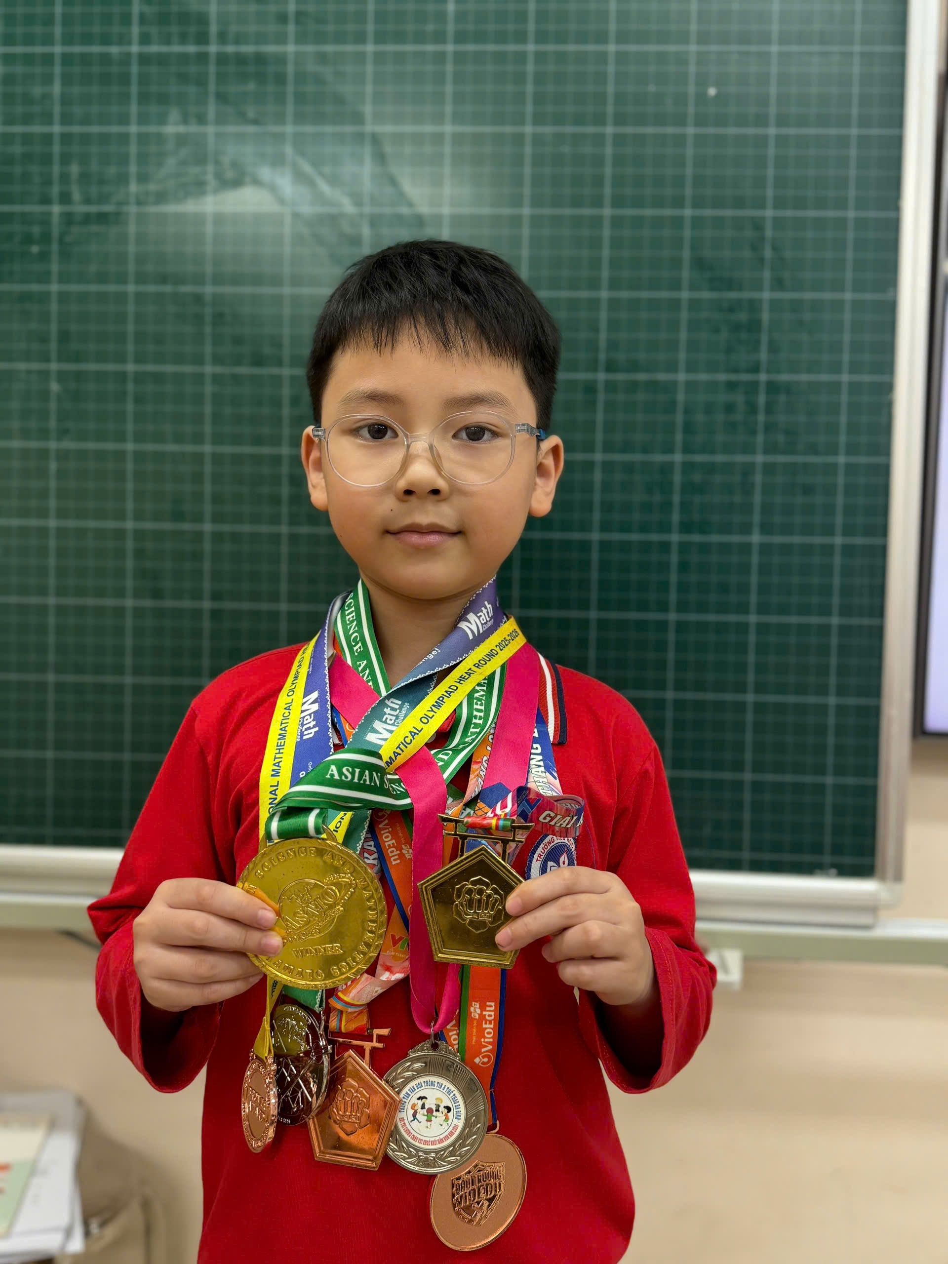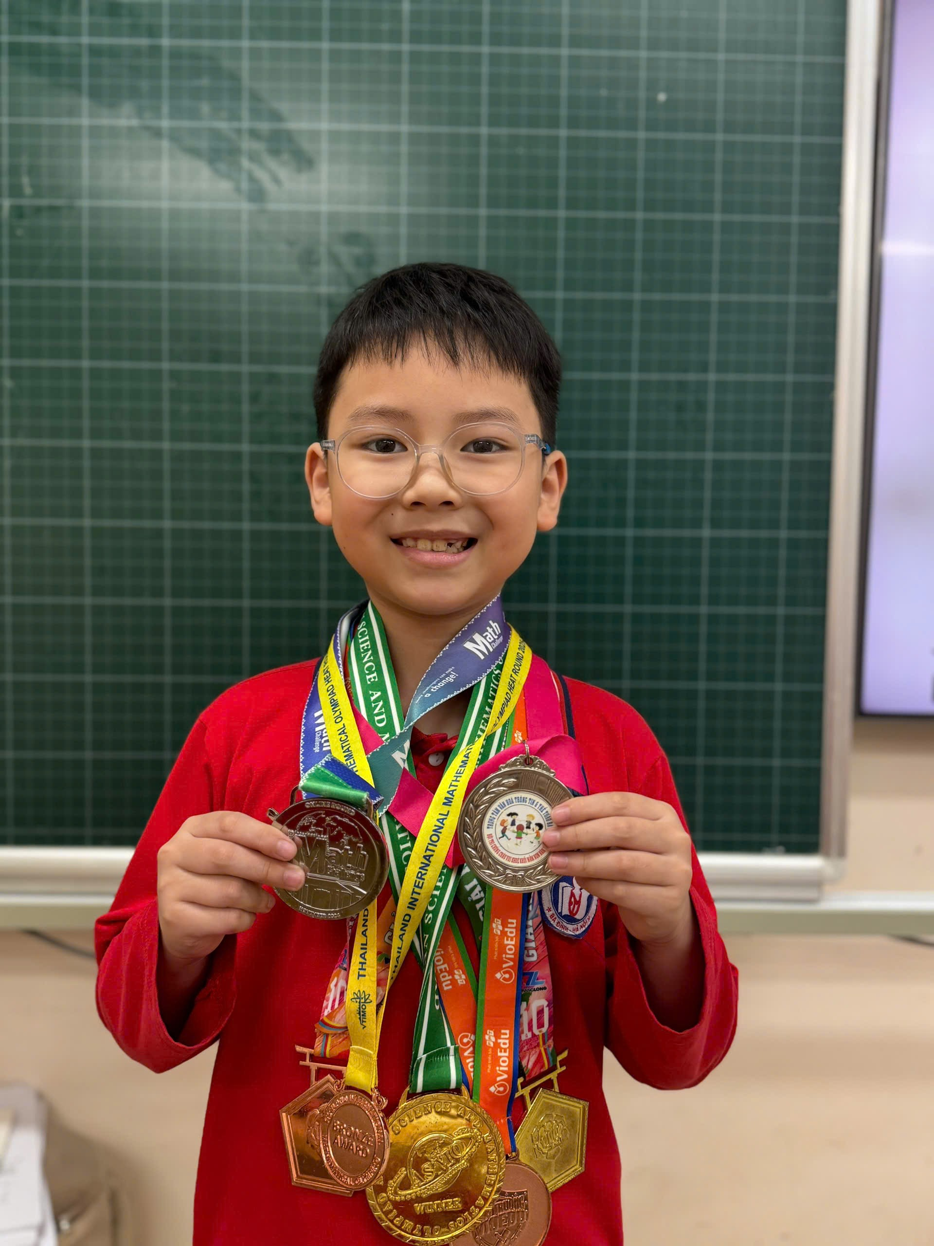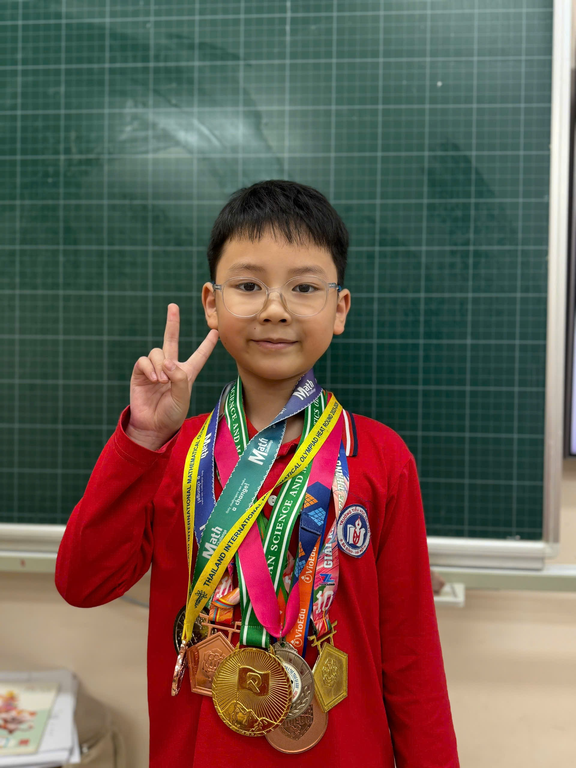 Không dừng lại ở đó, năm 2026, em tiếp tục bổ sung vào “gia tài” của mình với Huy chương Đồng Toán TIMO cấp Thành phố và đặc biệt là Huy chương Vàng ASMO cấp Quốc gia – minh chứng rõ nét cho tư duy logic, khả năng học toán vượt trội và sự nỗ lực không ngừng nghỉ.