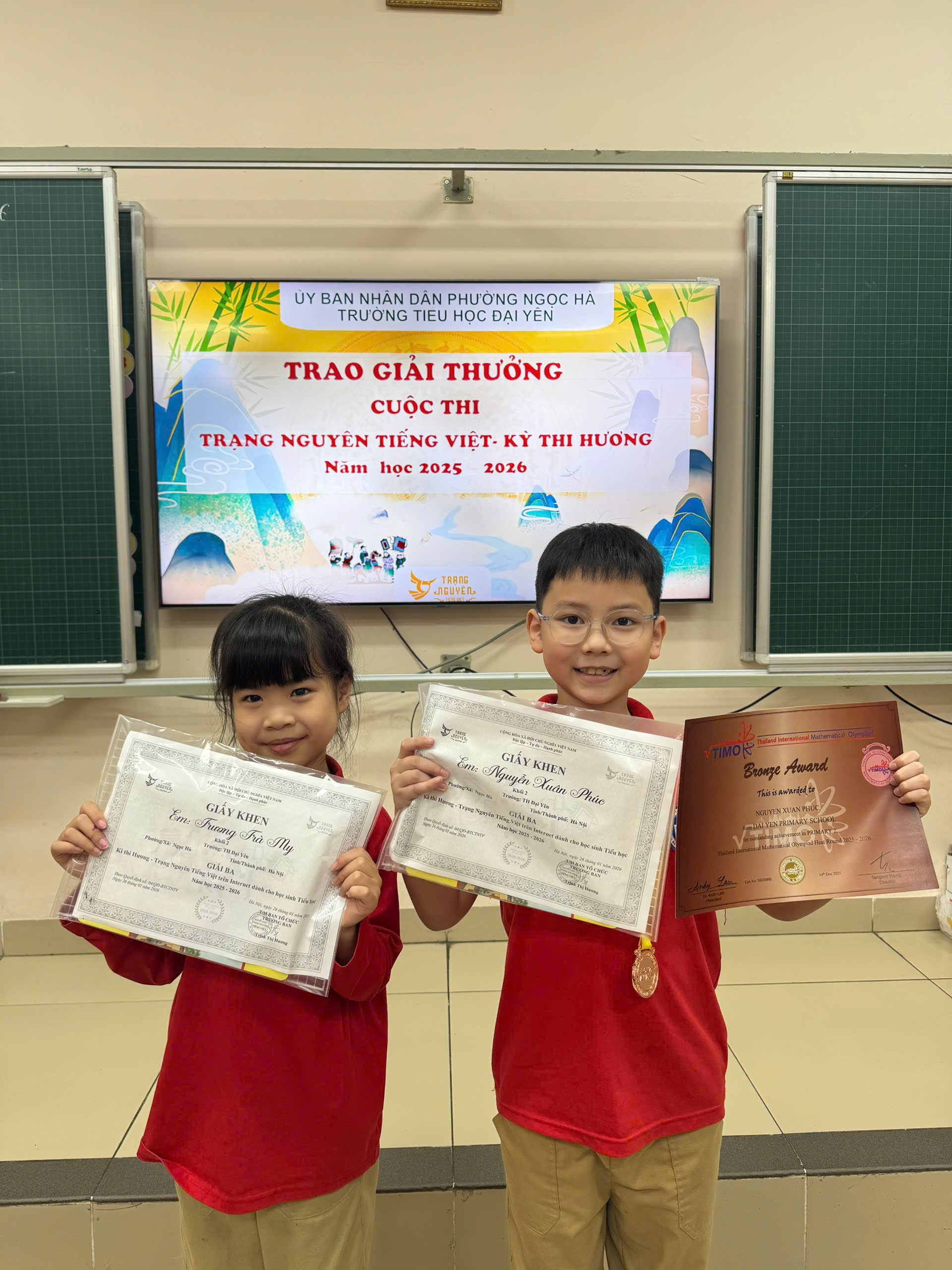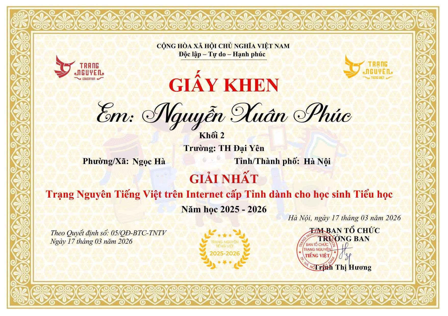 Ngoài huy chương, năm học 2025-2026, Phúc còn vinh dự đạt giải Nhất trong cuộc thi Trạng nguyên Tiếng Việt cấp Thành phố. Điều này chứng tỏ dù ở lĩnh vực nào em cũng tự tin chinh phục các giải thưởng.
