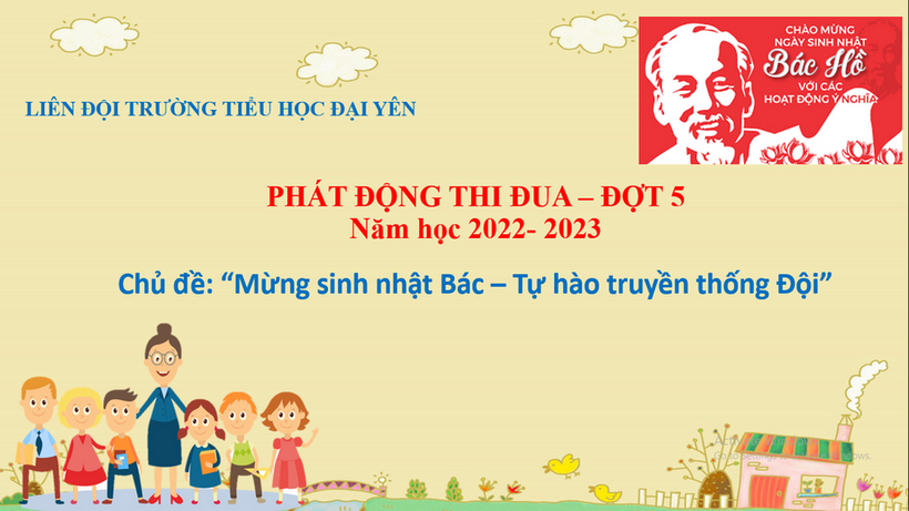 Liên đội Trường Tiểu học Đại Yên phát động tới các bạn học sinh toàn trường đợt thi đua cuối cùng của năm học 2022 – 2023 với Chủ đề “ Mừng sinh nhật bác – Tự hào truyền thống Đội”.