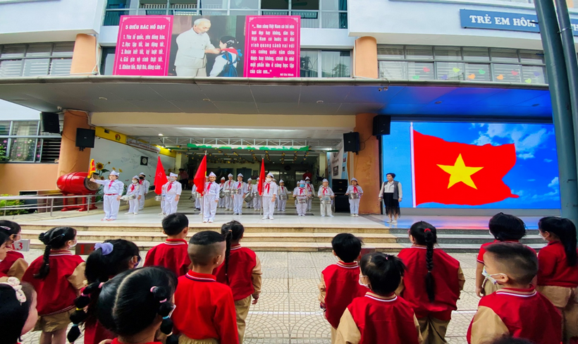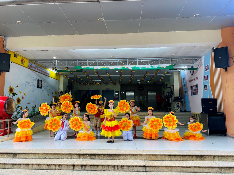 Tiếp nối chương trình cô Vũ Thị Hoa - Bí thư chi bộ, Hiệu trường - và cô giáo TPT tuyên dương các lớp có thi đua hạng nhất và hạng nhì của tuần.