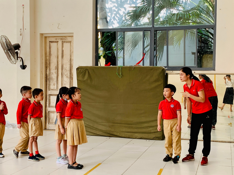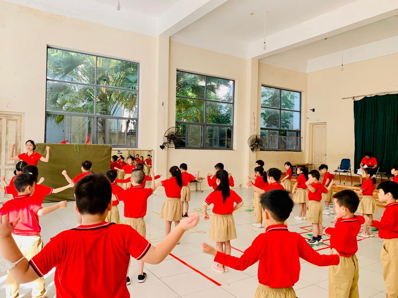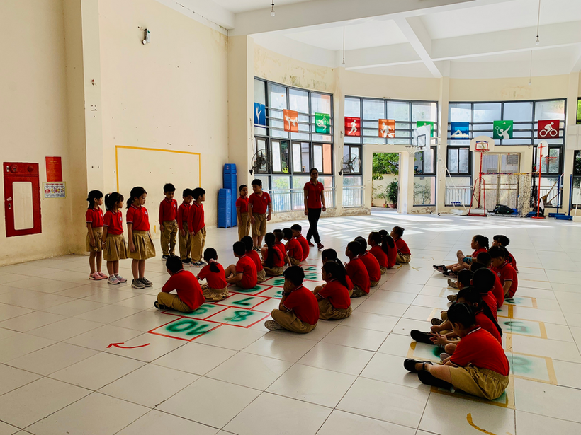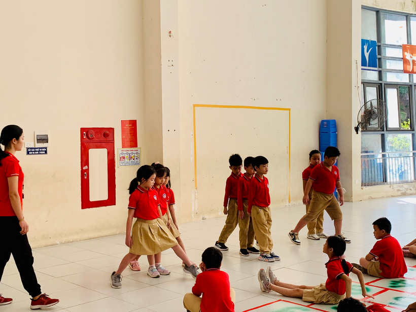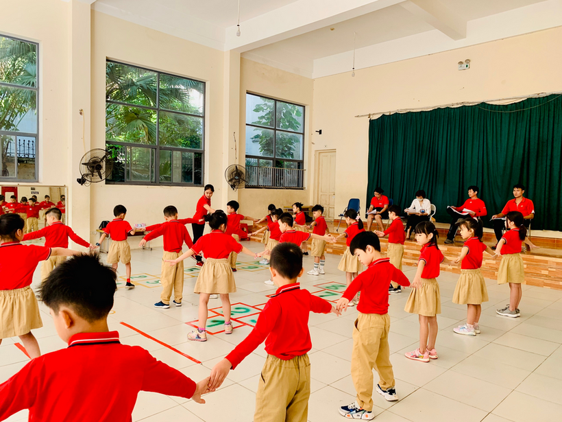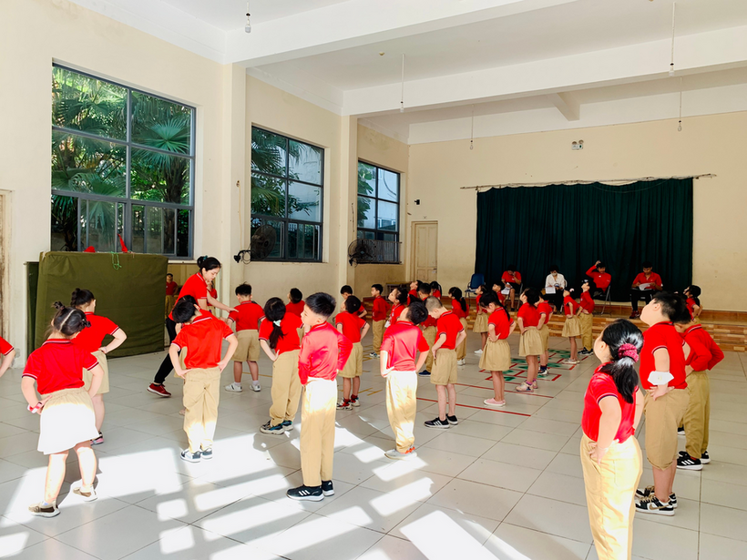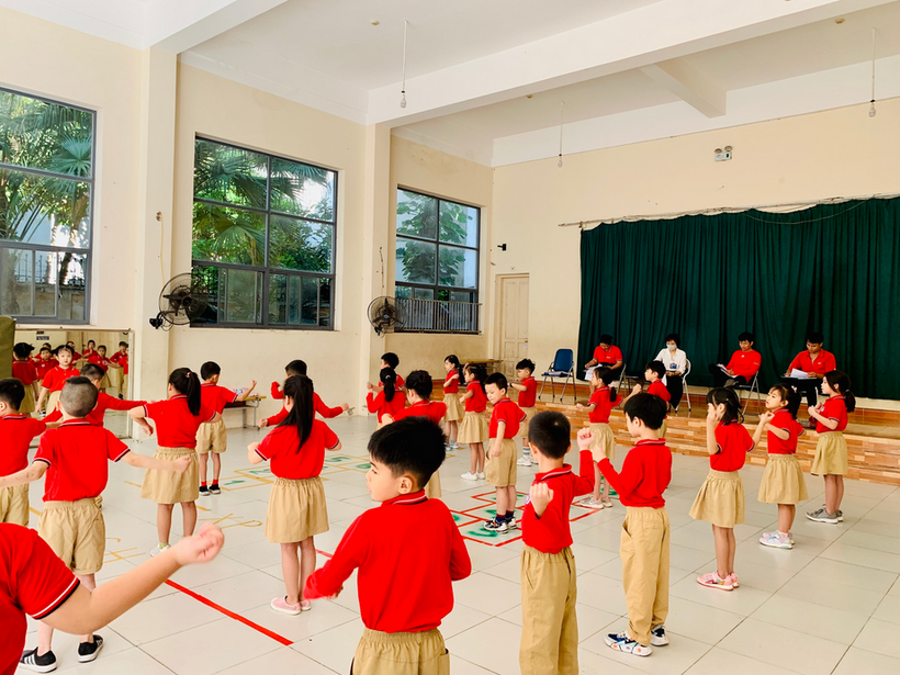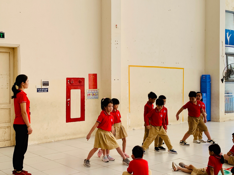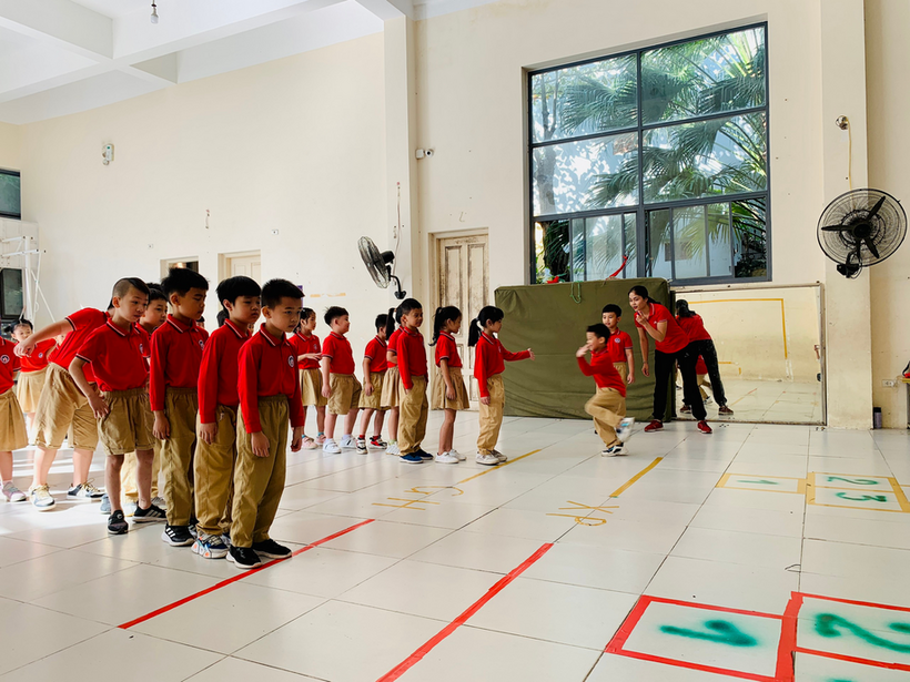 Bài mới không hề dễ nhưng dưới sự hướng dẫn kĩ càng của cô giáo cùng sự quan sát chăm chú của các bạn nhỏ khi xem cô giáo tập mẫu và cùng cô phân tích từng nhịp của động tác. Sau đó, các bạn học sinh chủ động tự mình di chuyển đội hình tập luyện theo khả năng của nhóm mình.