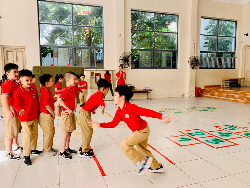 Tiết chuyên đề đã diễn ra rất sôi nổi với bài “ Biến đổi đội hình từ ba hàng ngang về một hàng ngang”. Đây là một nội dung mới và khó trong chương trình môn Thể dục lớp 2 nên Tổ đã quyết định xây dựng thành chuyên đề. Mở đầu tiết học là phần Điểm số - Báo cáo. Các bạn học sinh lớp 2 đã thật tự tin, dõng dạc khi triển khai hoạt động này. Phần Khởi động cũng do các bạn tự chủ động tiến hành dưới sự giám sát của cô giáo. Các bạn nhỏ thêm hứng khởi với trò chơi “ Nhảy ô tiếp sức”. Nhìn nụ cười tươi rói của các bạn ấy, thầy cô cũng thấy thật hào hứng.