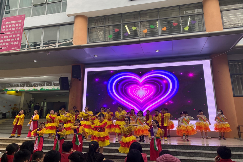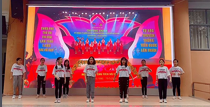 Để kết thúc chương trình là tiết mục văn nghệ của Khối 5 với bài nhảy sôi động.