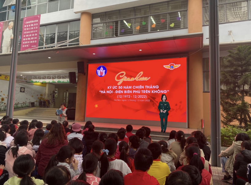 Học sinh toàn trường được lắng nghe chia sẻ từ bà Nguyễn Thị Thanh Vân kể lại về trận đánh hào hùng ngày 18/12 /1972, Hà Nội – Điện Biên Phủ trên không.