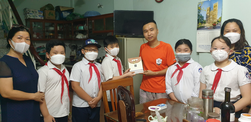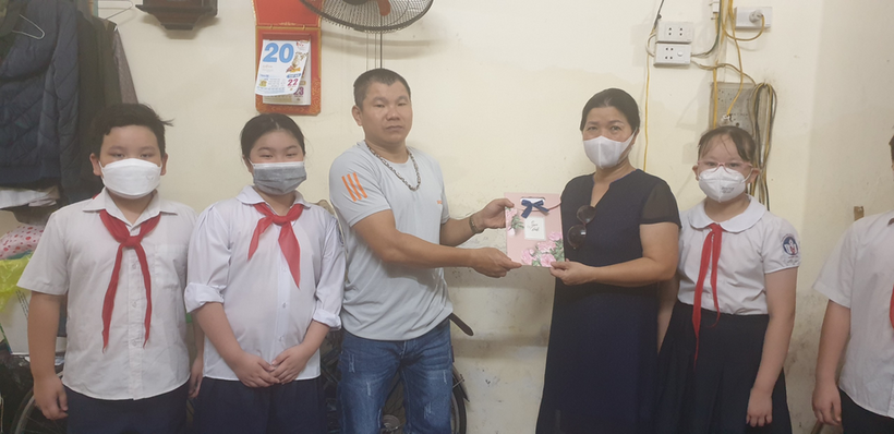 Cô Vũ Thị Hoa cùng các con học sinh gửi các món quà tri ân tới đại diện hai gia đình thương binh trong địa bàn phường Đội Cấn.