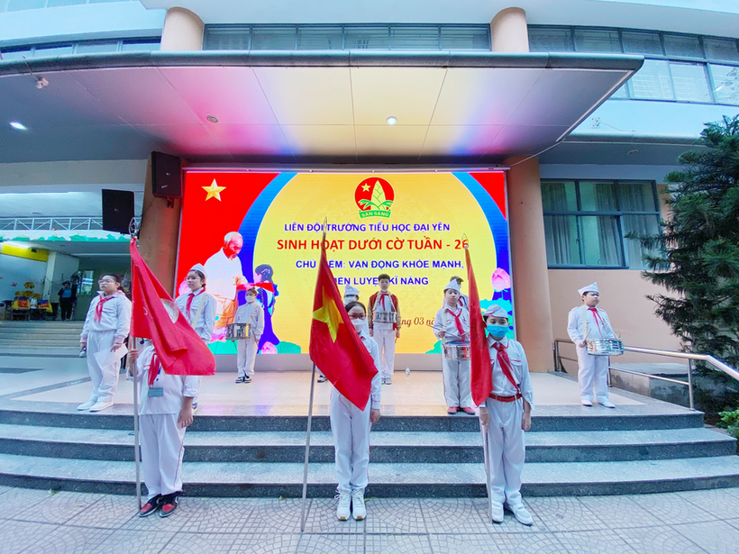 Bảo Trân tự tin chỉ huy đội trống cùng các bạn học sinh trong lễ Chào cờ đầu tuần