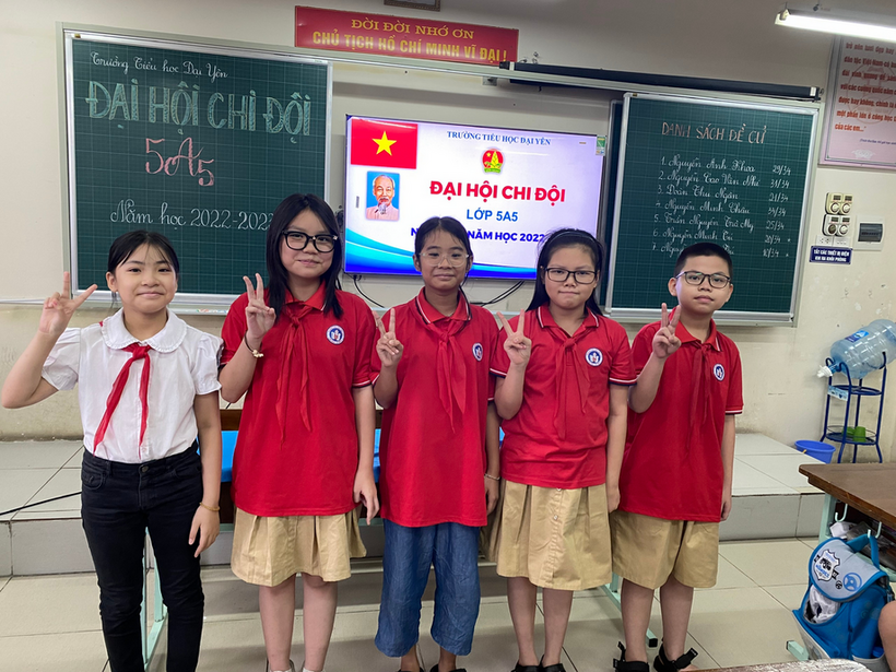 Học sinh Anh Khoa cùng Ban chỉ huy Chi đội lớp 5A5 trong năm học 2022-2023