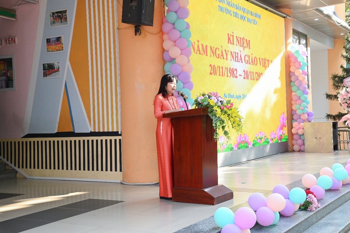 Tiếp theo chương trình chào mừng ngày 20/11 là phần phát biểu của cô Dương Thị Thu – Bí thư chi bộ - Hiệu trưởng nhà trường, cô đặc biệt chia sẻ sự tri ân đến các thầy cô giáo đang làm việc rất hăng say, yêu nghề đang làm việc tại trường Tiểu học Đại Yên. Đặc biệt cô đã giành nhiều tình cảm, sự trân trọng, tri ân tới các cô giáo đã từng công tác tại trường. Cô nói để có được thành tích như ngày hôm nay là nhờ những đóng góp to lớn của quý thầy (cô) đã từng công tác, giảng dạy dưới mái trường TH Đại Yên này. Đó là những hi sinh thầm lặng, hết lòng dìu dắt biết bao thế hệ học trò với tấm lòng tận tuỵ. Chúng ta không thể quên hình ảnh những người cô, người chị, người đồng nghiệp - đồng chí ân cần, chan hoà, cởi mở. Trong suốt nhiều năm công tác trong ngành giáo dục, các Thầy cô đã cống hiến hết mình cho sự nghiệp trồng người và giờ đây, chúng tôi - những người giáo viên thế hệ trẻ, những học sinh của thế hệ tương lai xin hứa sẽ nỗ lực mỗi ngày để mái trường TH Đại Yên ngày một to lớn và phát triển.