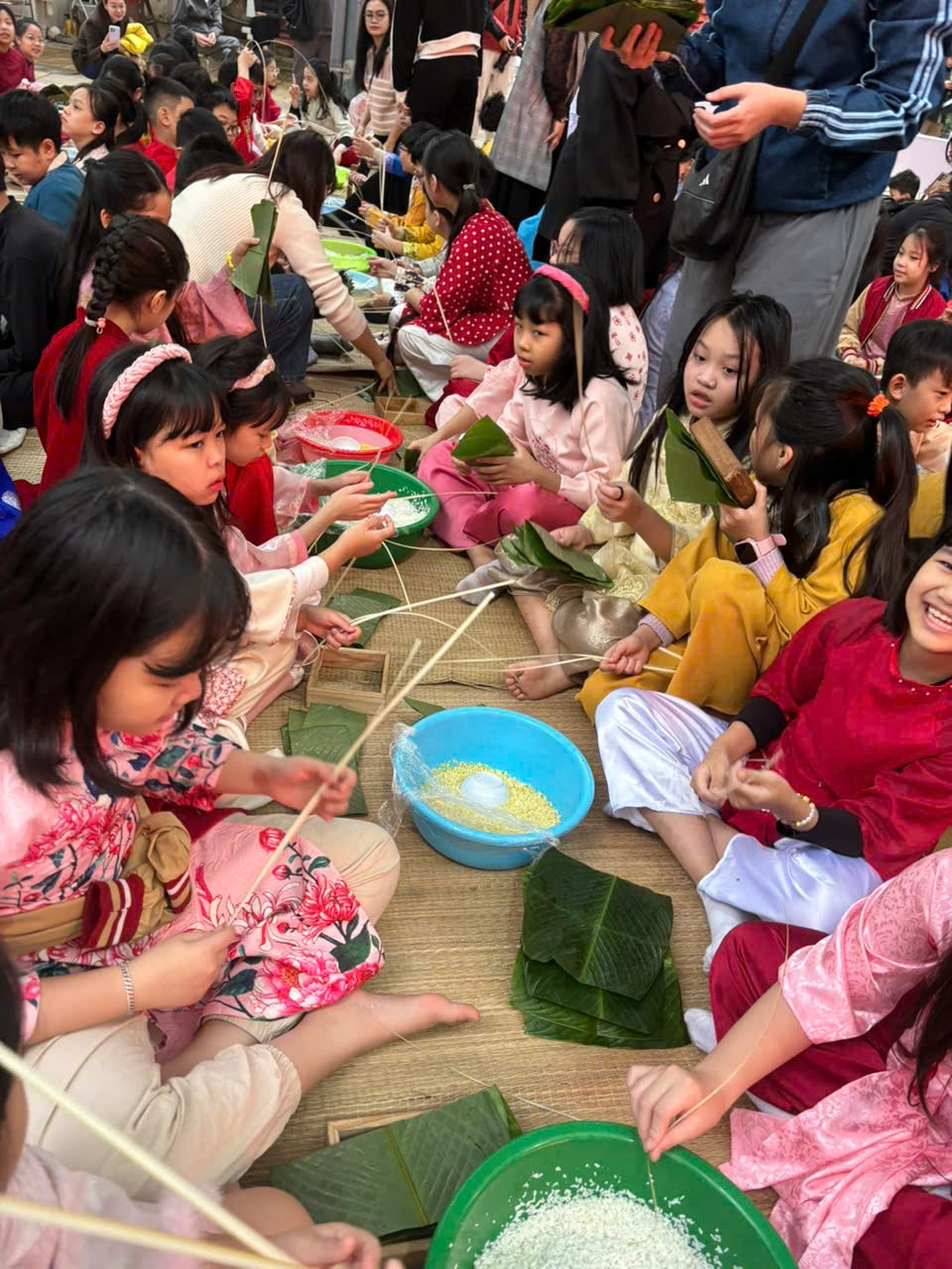 Dưới sự hướng dẫn tận tình của thầy cô, phụ huynh và các anh chị hướng dẫn viên, các bạn học sinh lần lượt học cách xếp lá, đong gạo, cho nhân và gói bánh. Có bạn còn lúng túng làm bánh méo xệch, có bạn gói rất khéo khiến cả lớp trầm trồ. Tiếng cười, tiếng gọi nhau í ới vang lên khắp sân trường, tạo nên một bức tranh lễ hội thật sinh động.