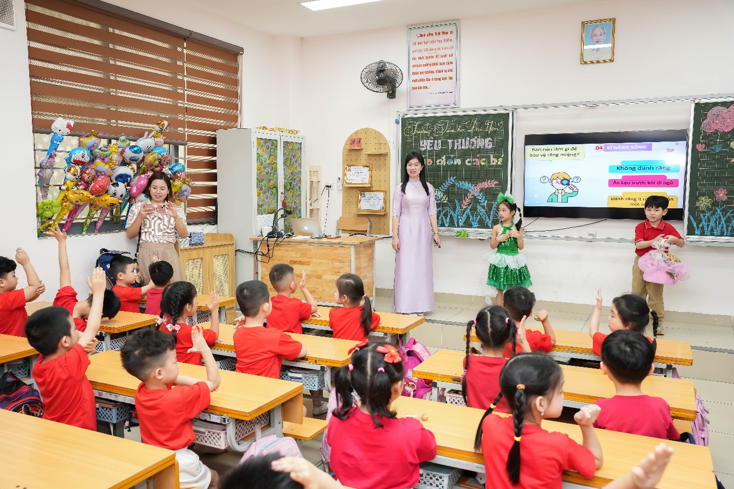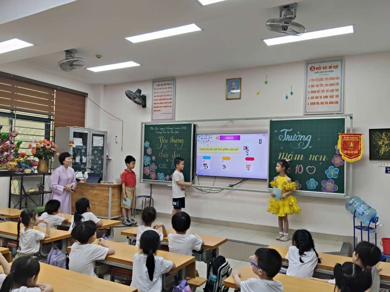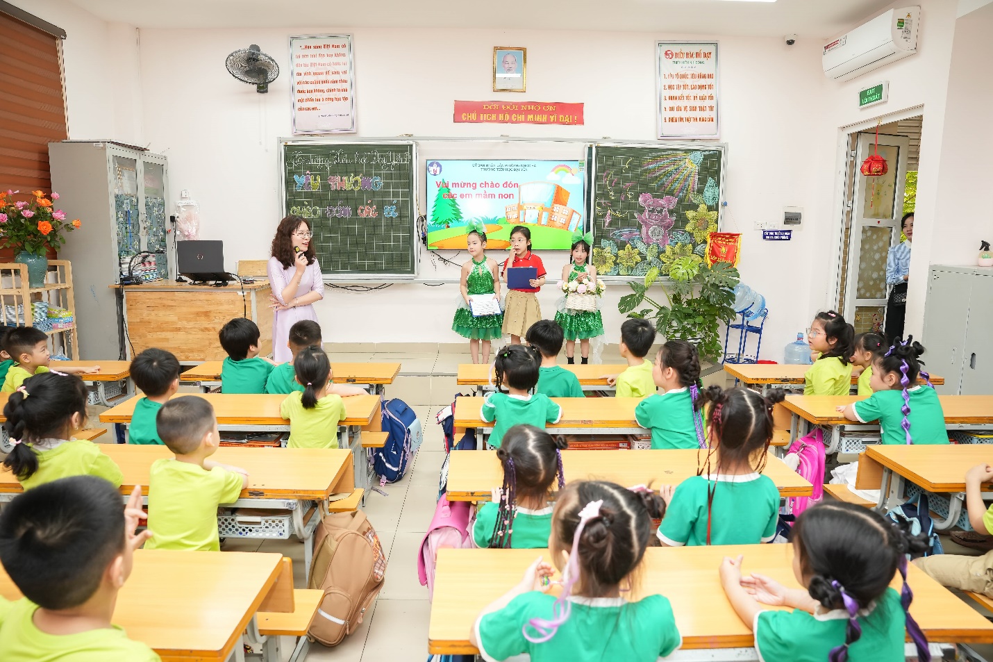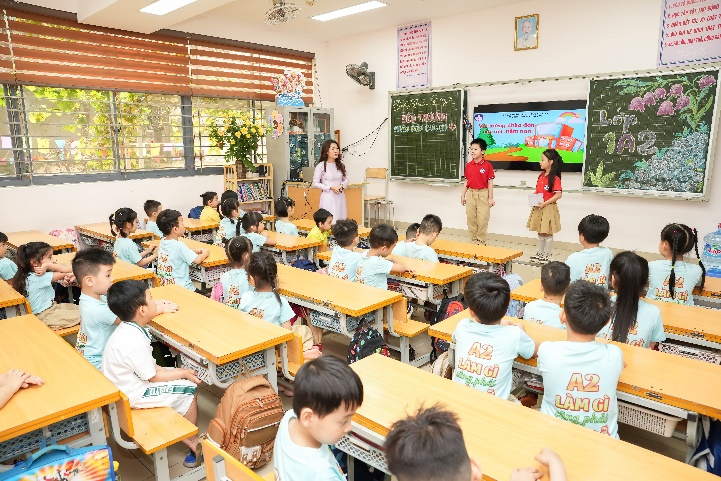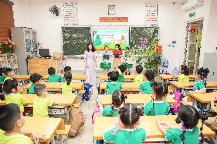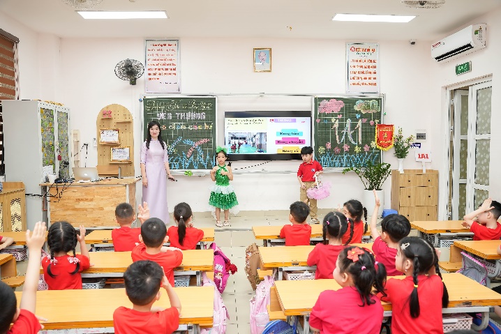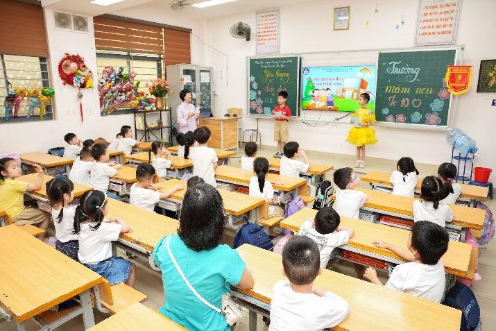 Phần được mong chờ nhất chính là hoạt động trải nghiệm lớp học. Các bé được trực tiếp vào lớp, ngồi ngay ngắn như những học sinh lớp 1 thực thụ, tham gia trả lời câu hỏi và giao lưu cùng thầy cô. Đặc biệt, tại các lớp 1, các em đã được hai anh chị học sinh đảm nhận vai trò MC dẫn dắt, hướng dẫn, tạo không khí gần gũi và hào hứng cho các em nhỏ.