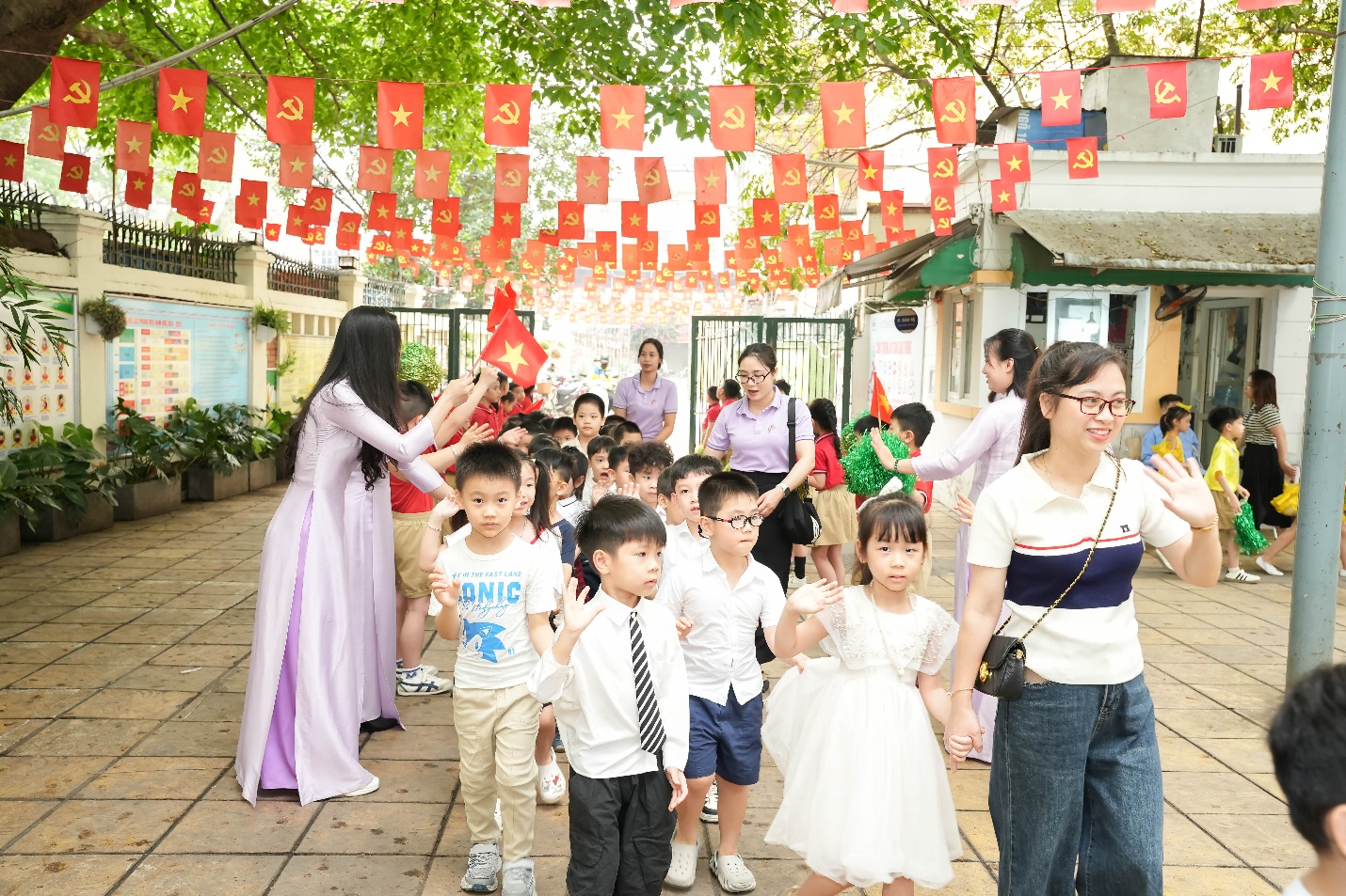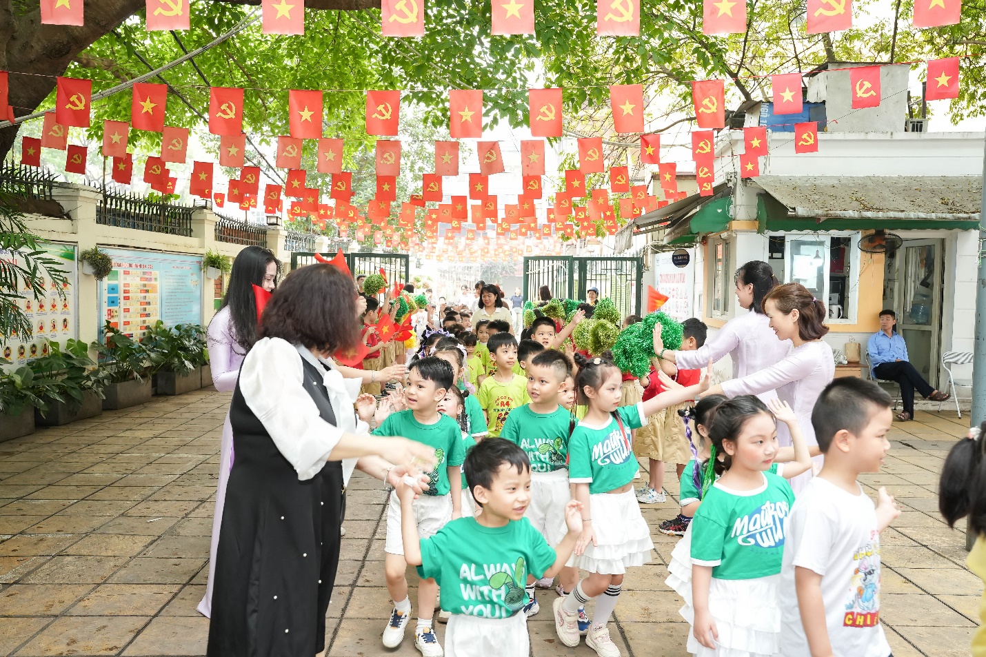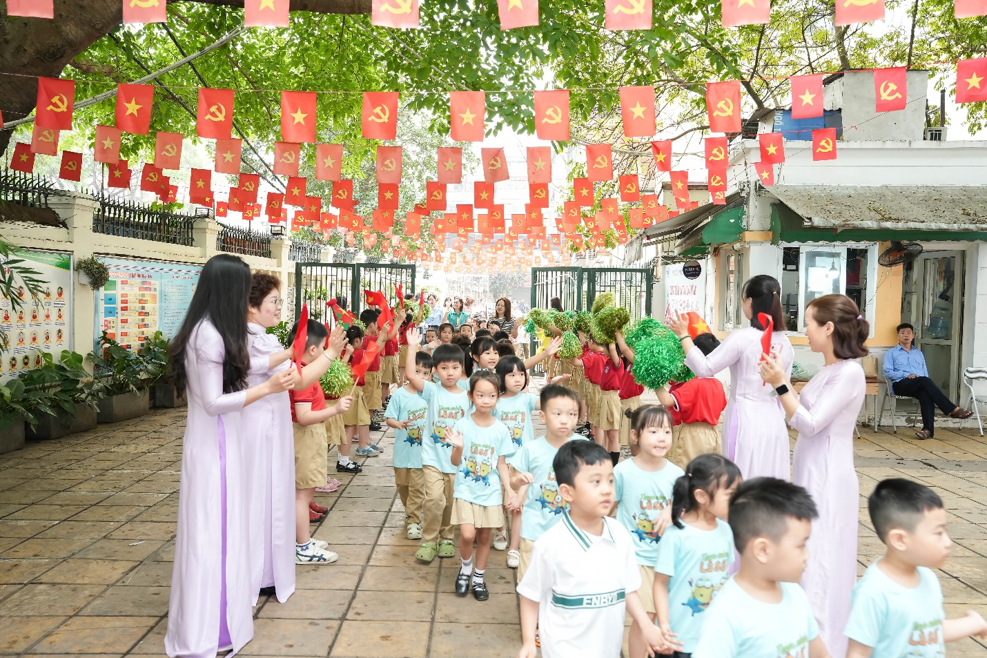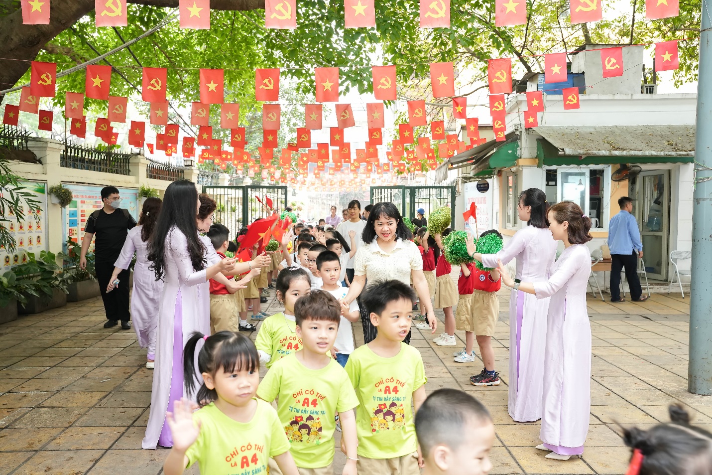 Ngay từ đầu buổi sáng, không khí trở nên rộn ràng khi học sinh khối 1 xếp hàng ngay ngắn dưới sân trường, nồng nhiệt chào đón các bé mầm non đang tiến vào từ cổng trường trong tiếng nhạc vui tươi và những tràng pháo tay cổ vũ.
