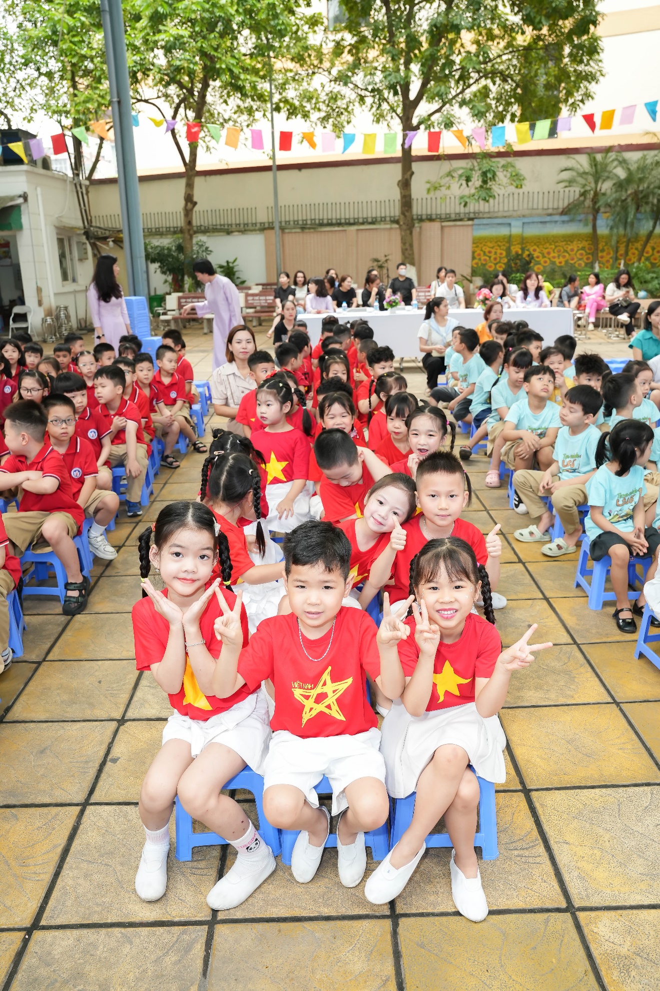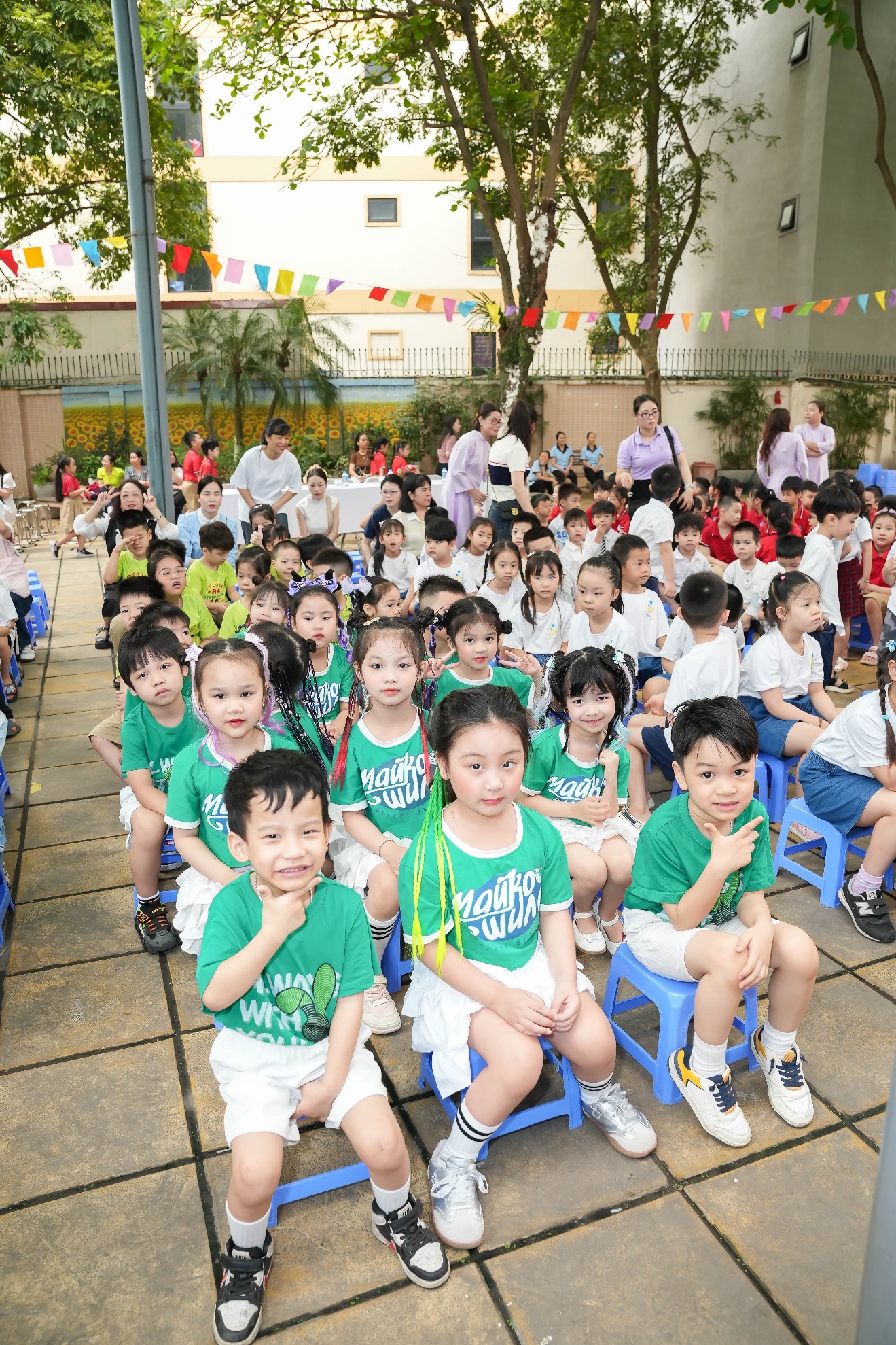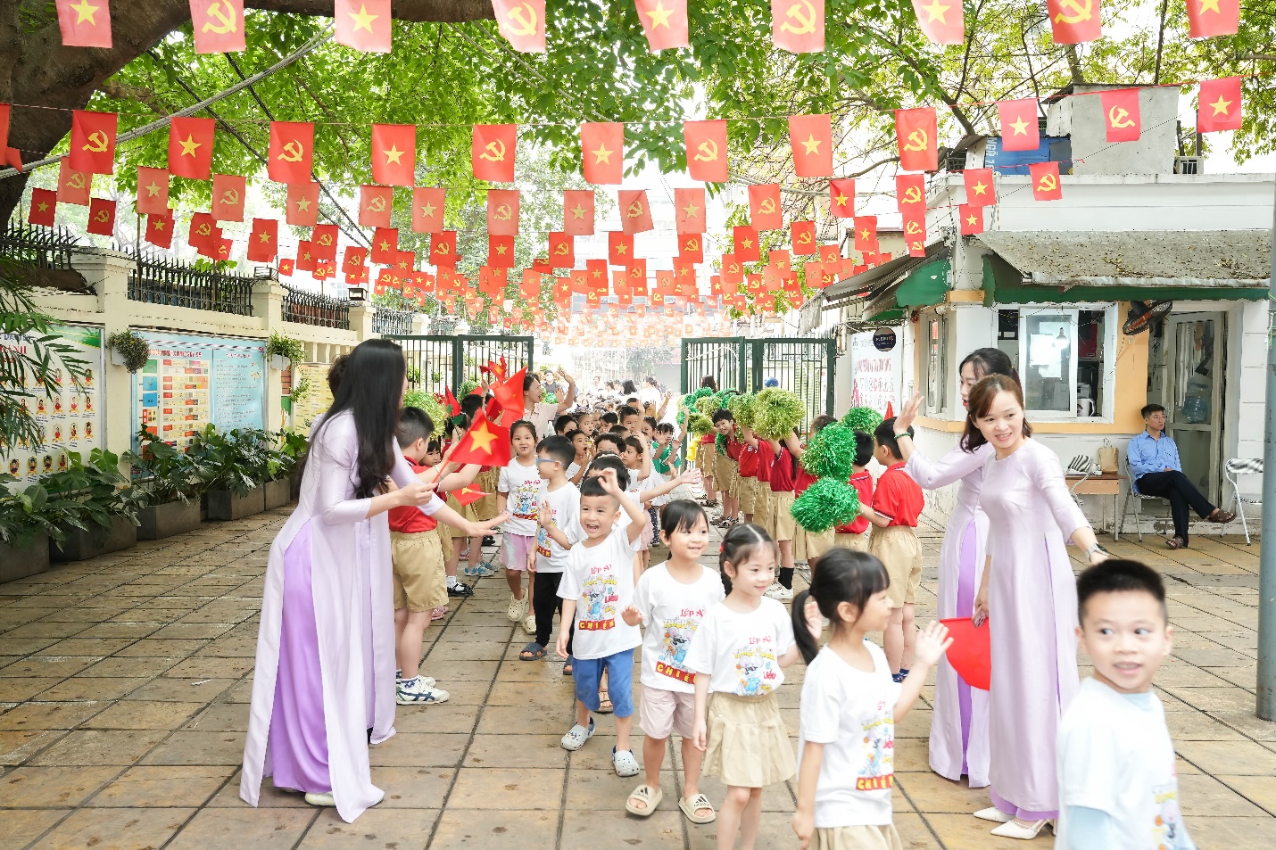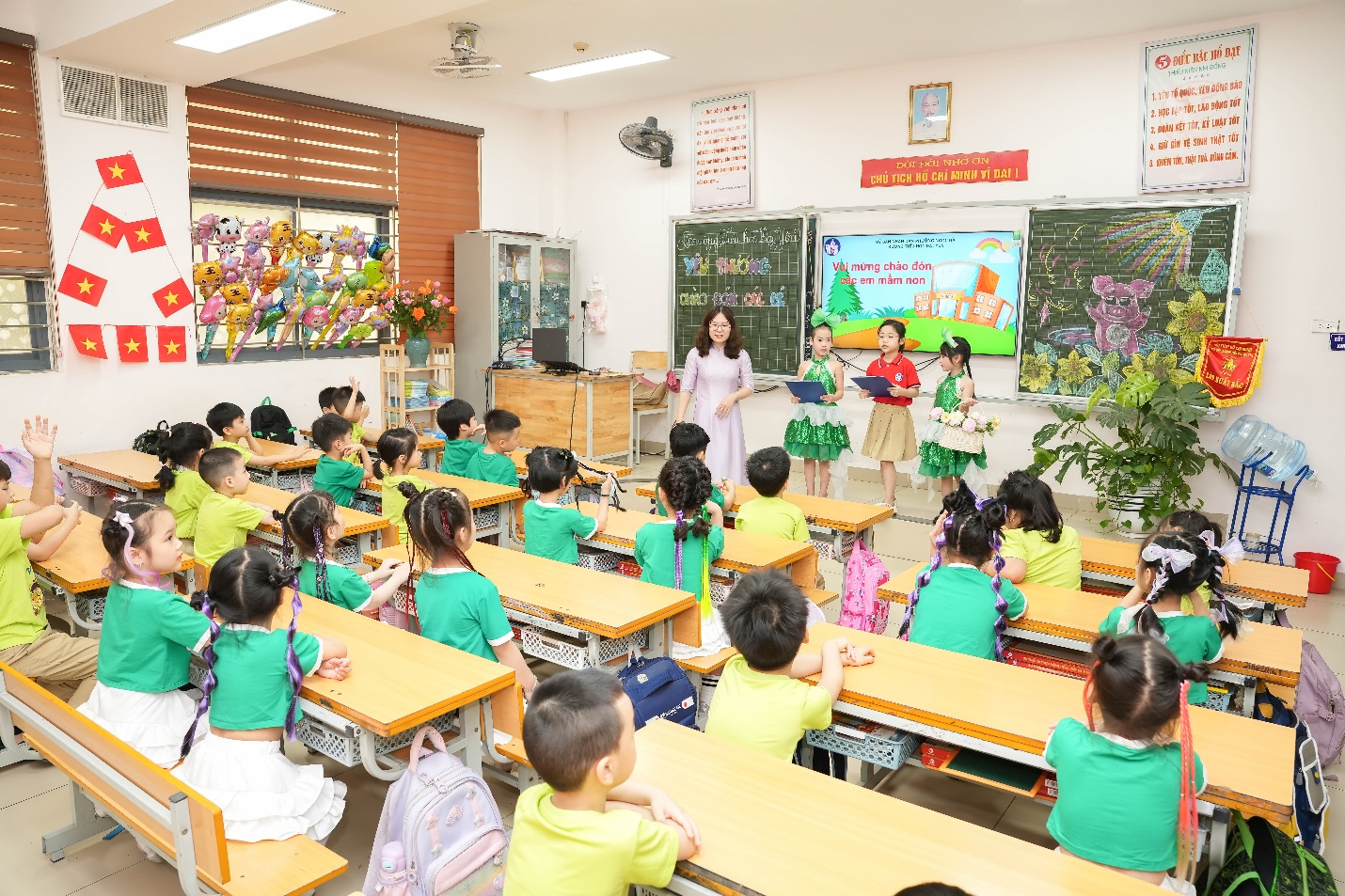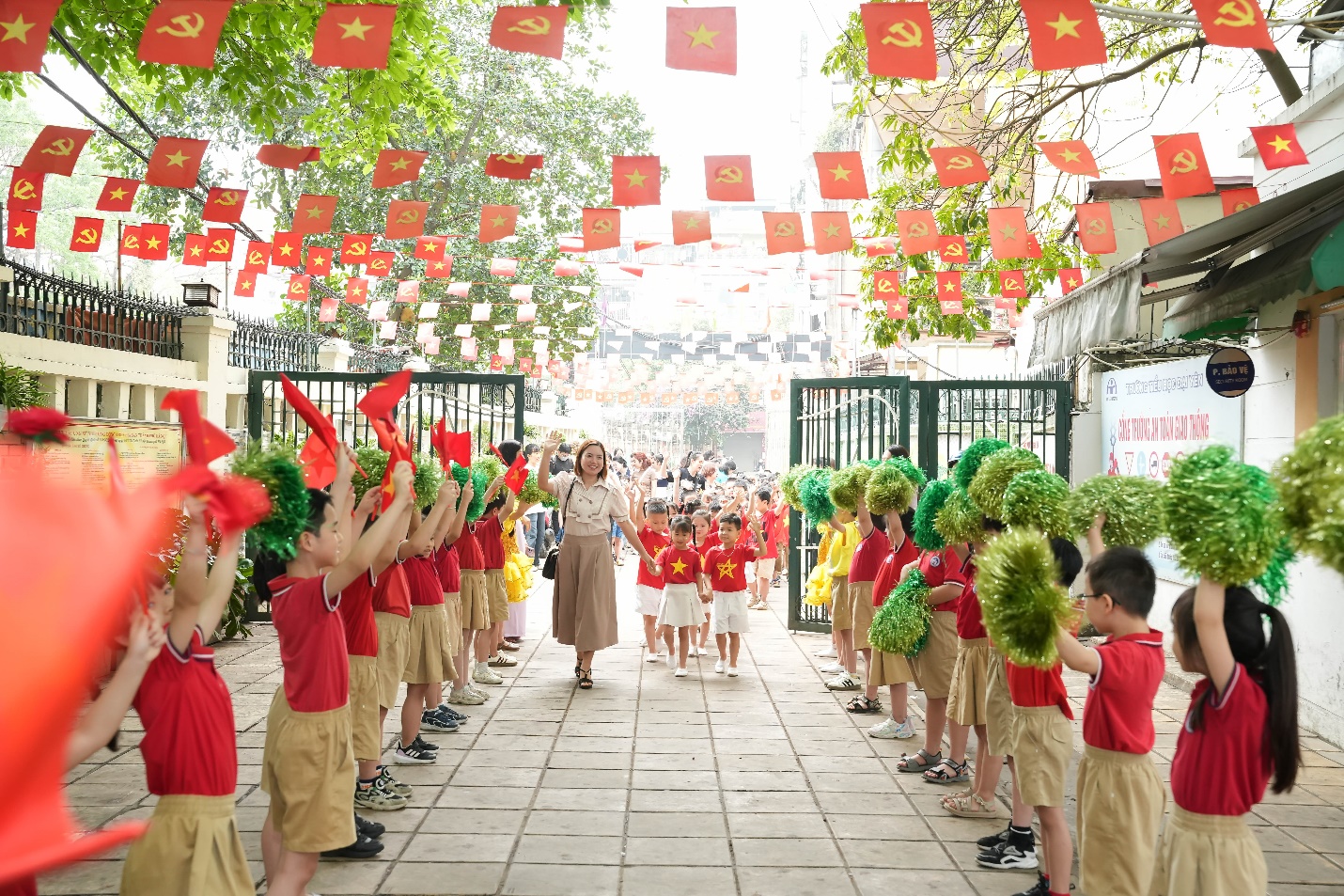 Ngay từ đầu buổi sáng, không khí trở nên rộn ràng khi học sinh khối 1 xếp hàng ngay ngắn dưới sân trường, nồng nhiệt chào đón các bé mầm non đang tiến vào từ cổng trường trong tiếng nhạc vui tươi và những tràng pháo tay cổ vũ.