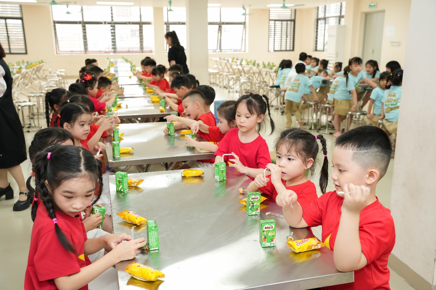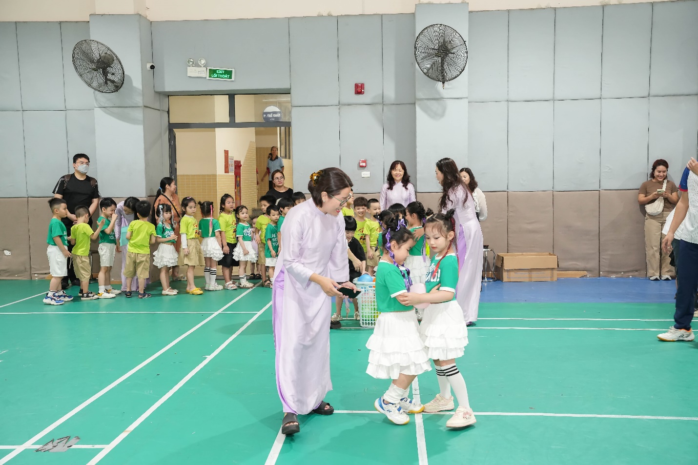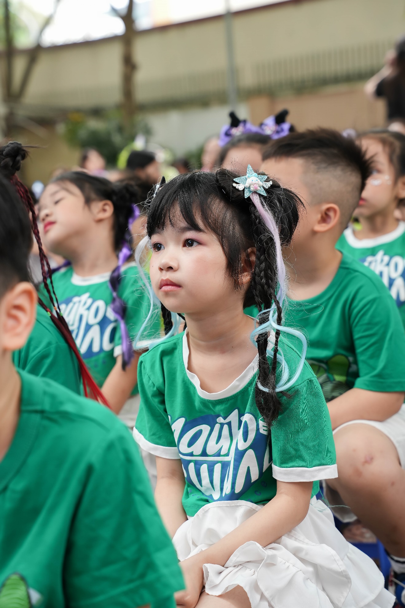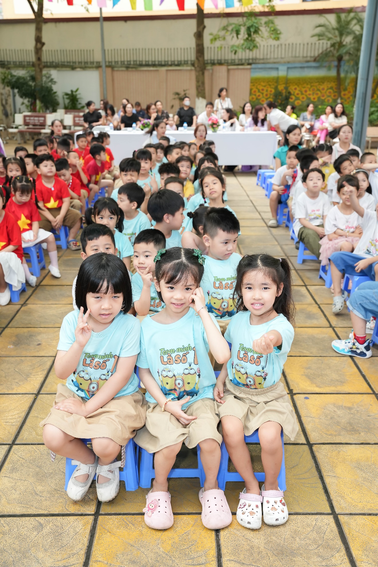 Ngay từ đầu buổi sáng, không khí trở nên rộn ràng khi học sinh khối 1 xếp hàng ngay ngắn dưới sân trường, nồng nhiệt chào đón các bé mầm non đang tiến vào từ cổng trường trong tiếng nhạc vui tươi và những tràng pháo tay cổ vũ.