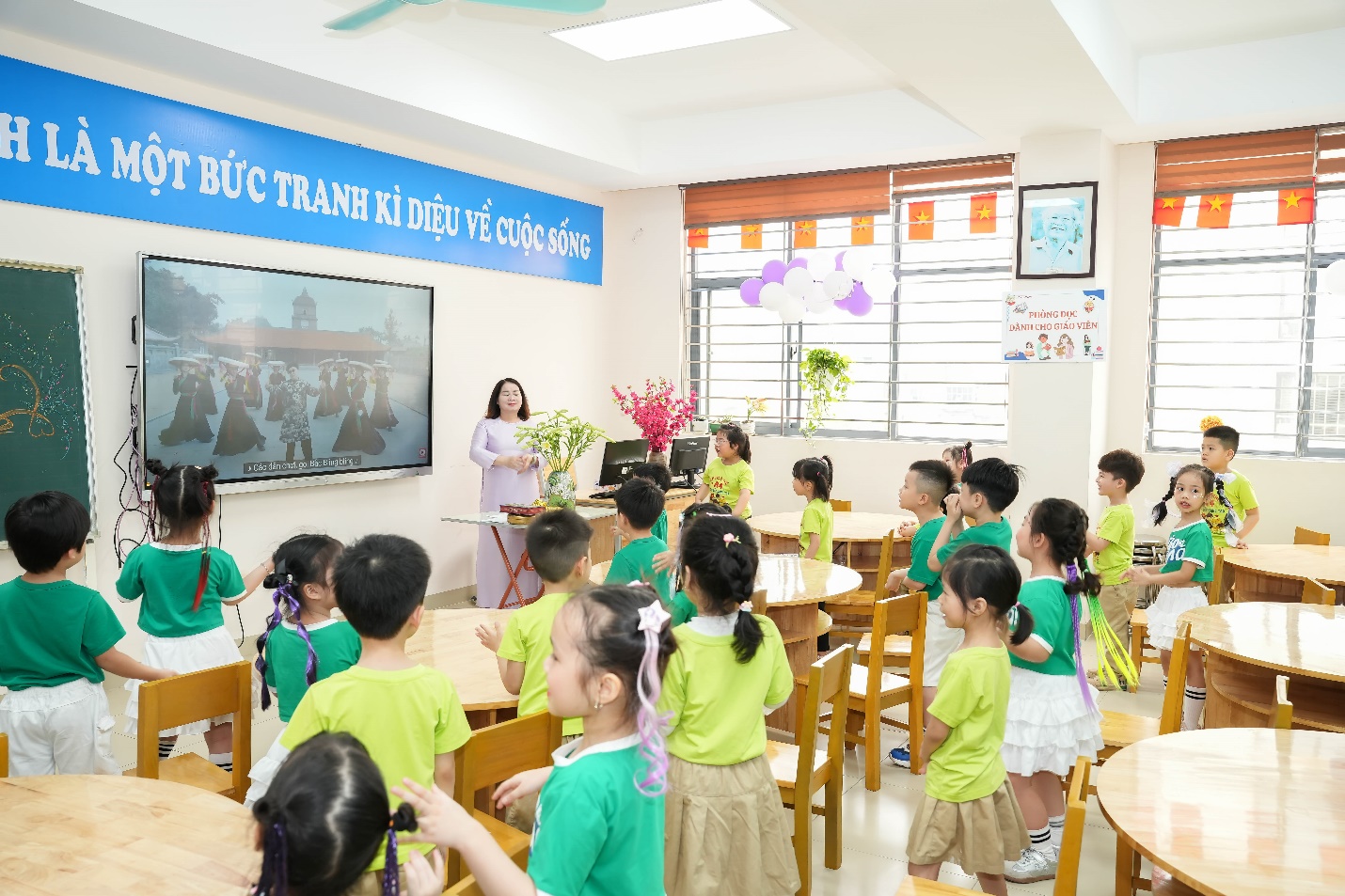 Các bé tiếp tục được theo dõi video giới thiệu về nhà trường, qua đó hiểu thêm về môi trường học tập thân thiện, hiện đại cũng như những thành tích nổi bật mà thầy và trò Trường Tiểu học Đại Yên đã đạt được.