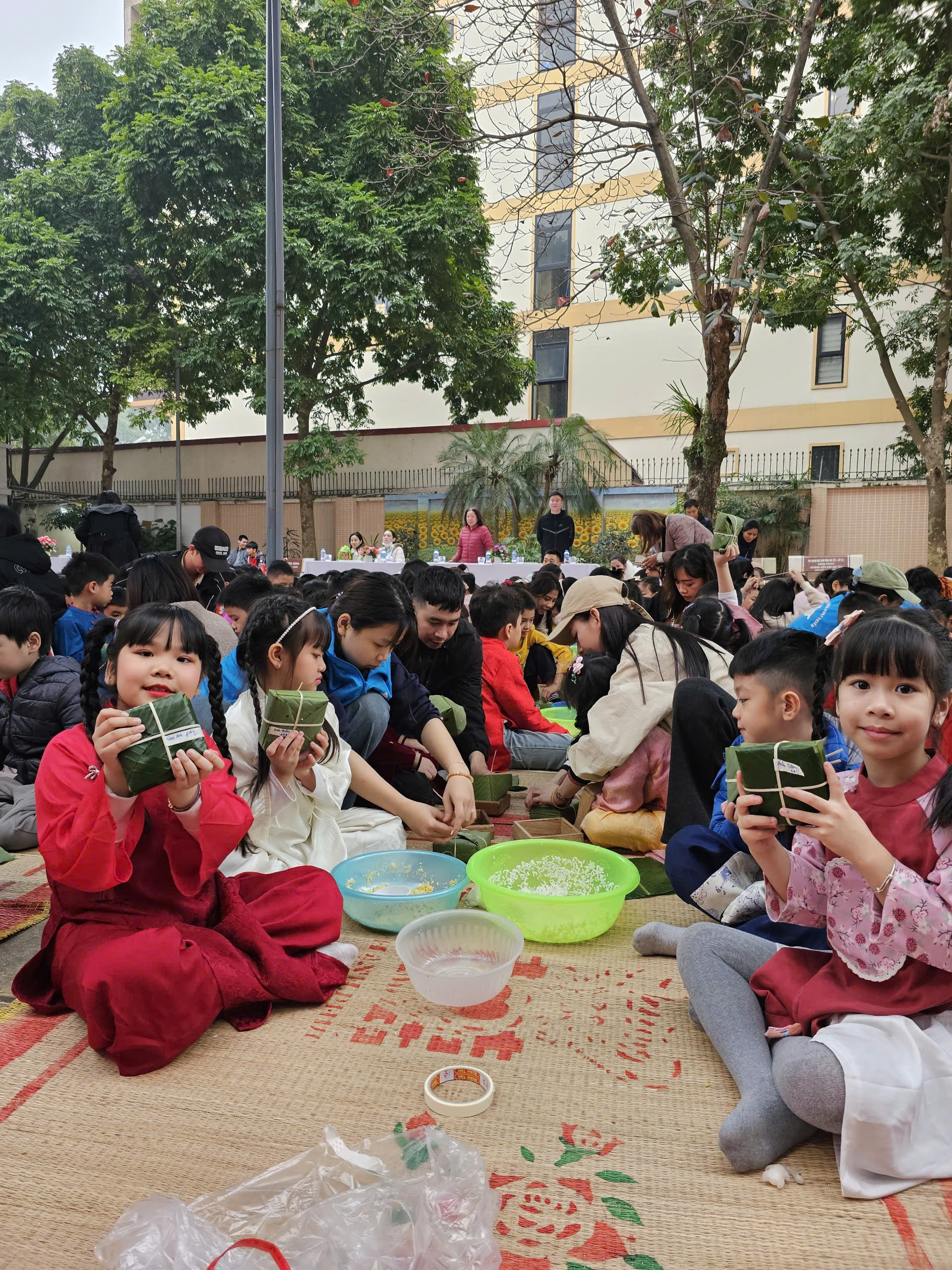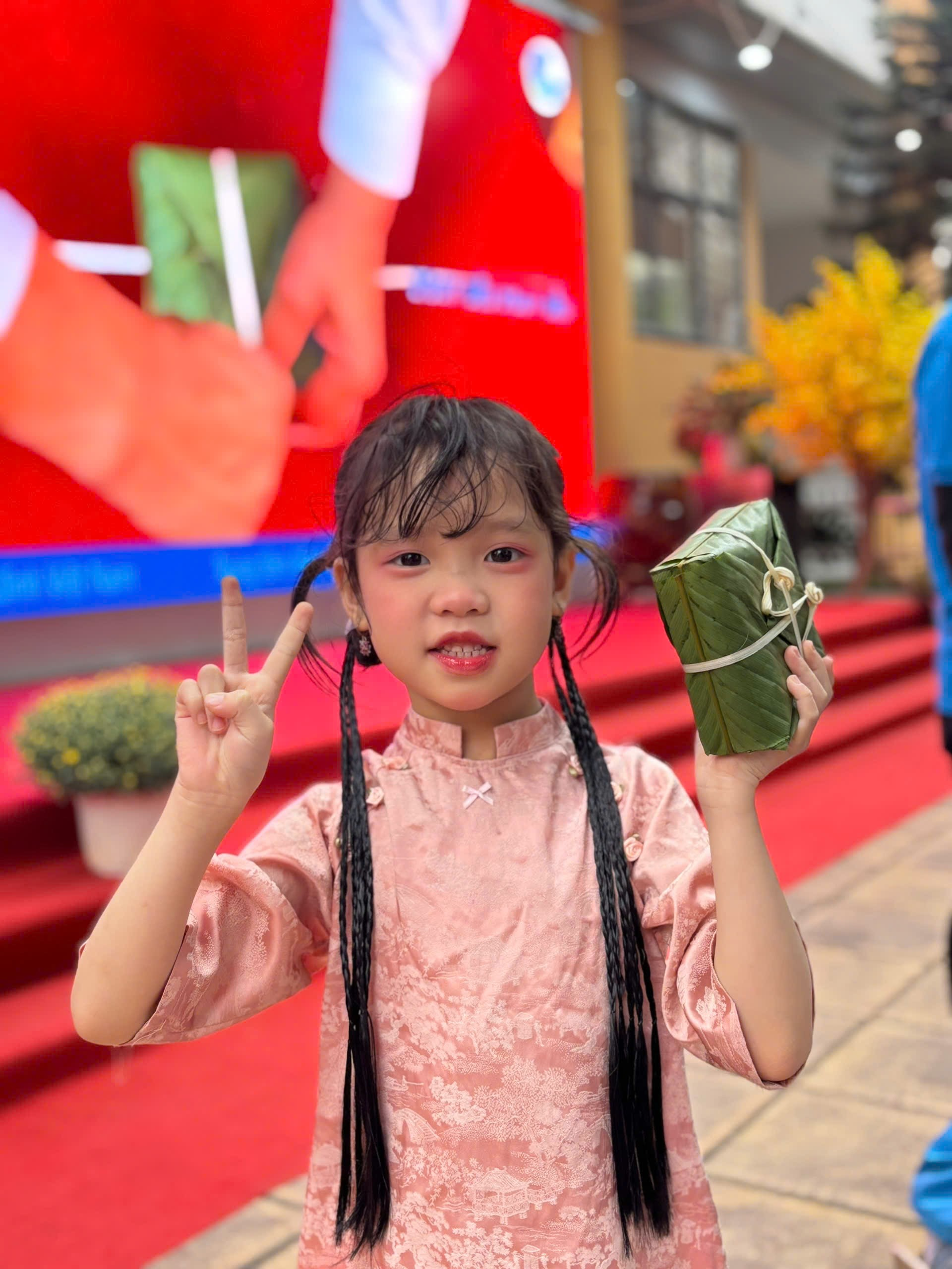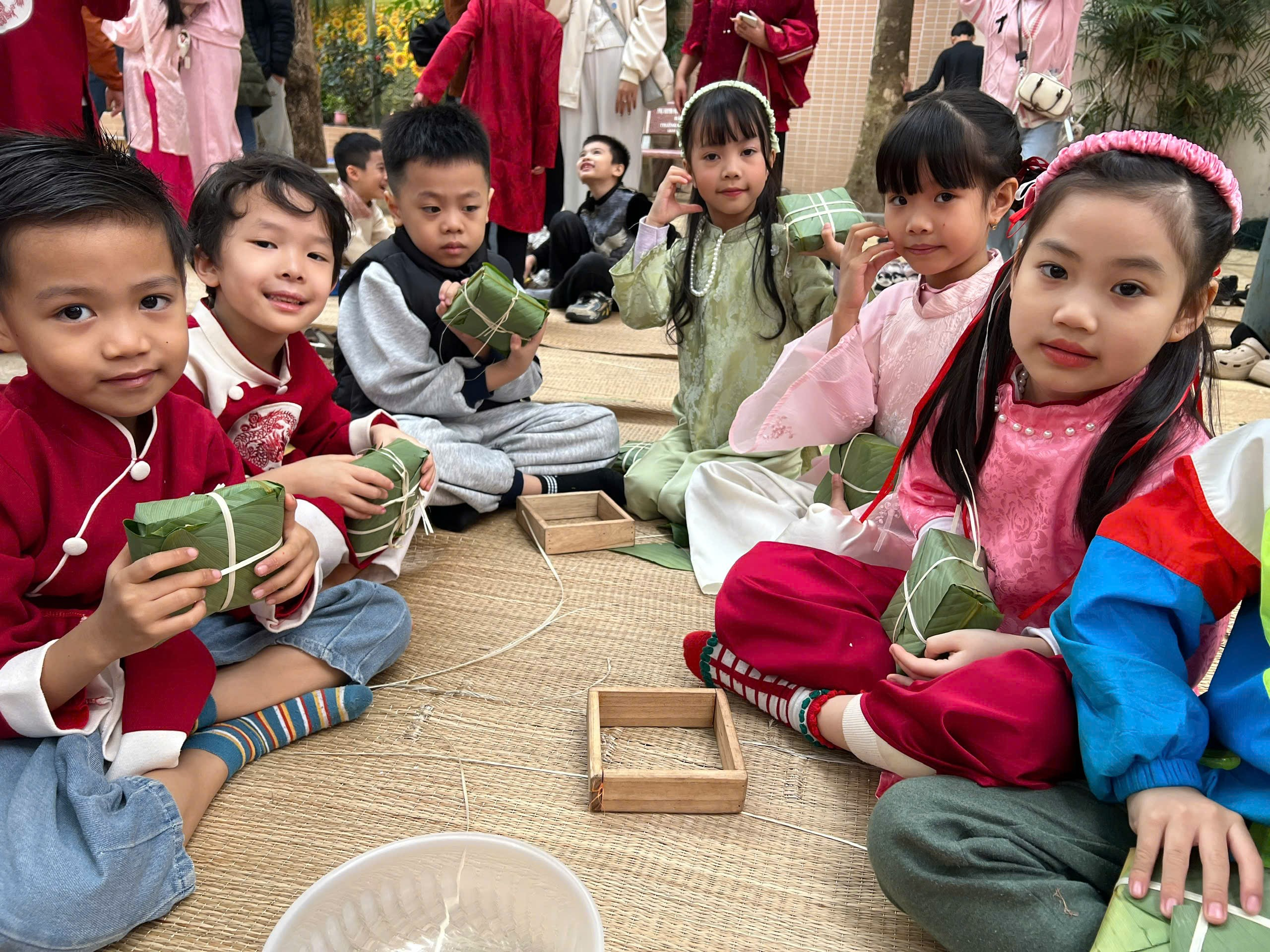 Dưới sự hướng dẫn tận tình của thầy cô giáo và sự đồng hành ấm áp của các bậc phụ huynh, những bàn tay nhỏ xinh lần đầu tiên được tự tay gói những chiếc bánh chưng vuông vắn. Từng lớp lá dong xanh mướt, từng hạt gạo nếp trắng ngần, từng sợi lạt buộc khéo léo… đều được các con nâng niu, gửi gắm vào đó niềm háo hức và sự tự hào. Ánh mắt chăm chú, nụ cười rạng rỡ của các em khiến không gian ngày hội thêm ấm áp, yêu thương.